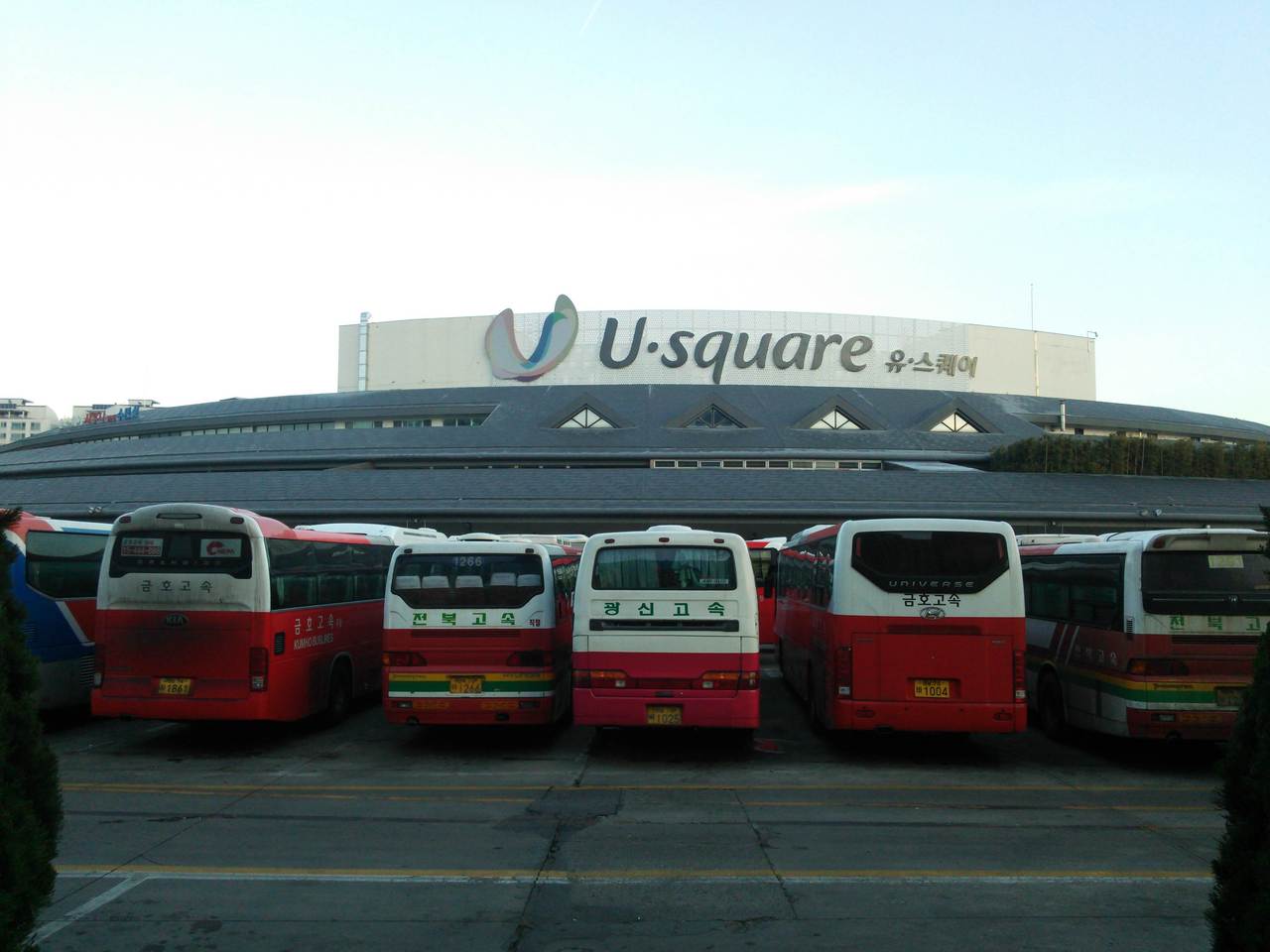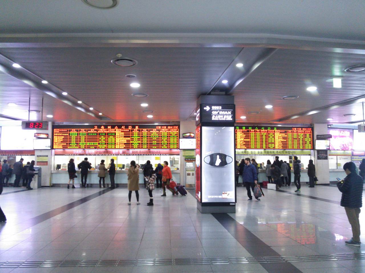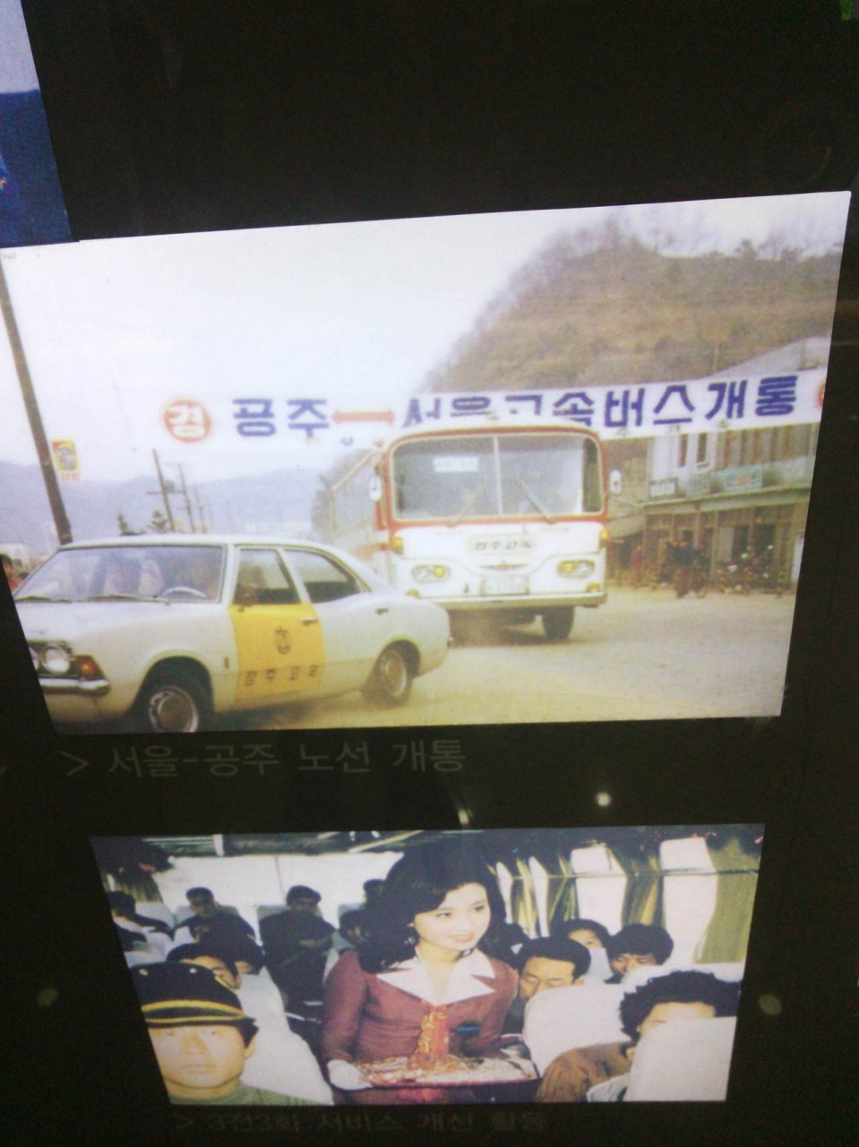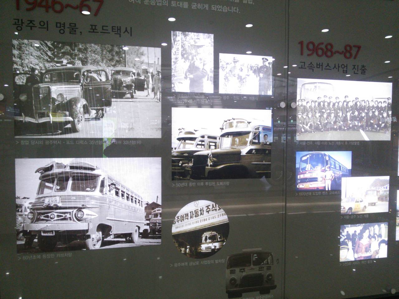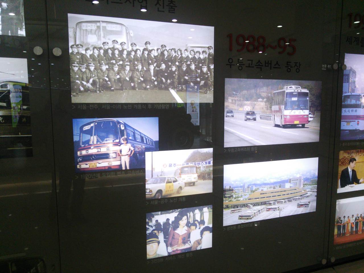 ソウル、釜山、仁川空港はもちろん、韓国の大きな都市を結ぶ便は、まず運行しています。バス乗り場の入口には、昔のバスターミナルのヒストリーをパネル展示していて、古い光州のターミナルやバスの写真を見れました。