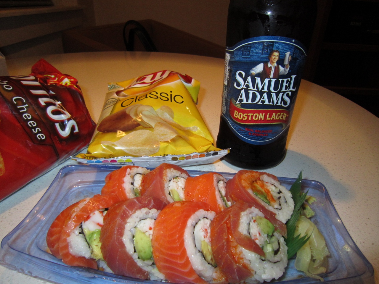 サーモンロールとボストンのローカルビール、サミュエルアダムスを買ってお夕食。