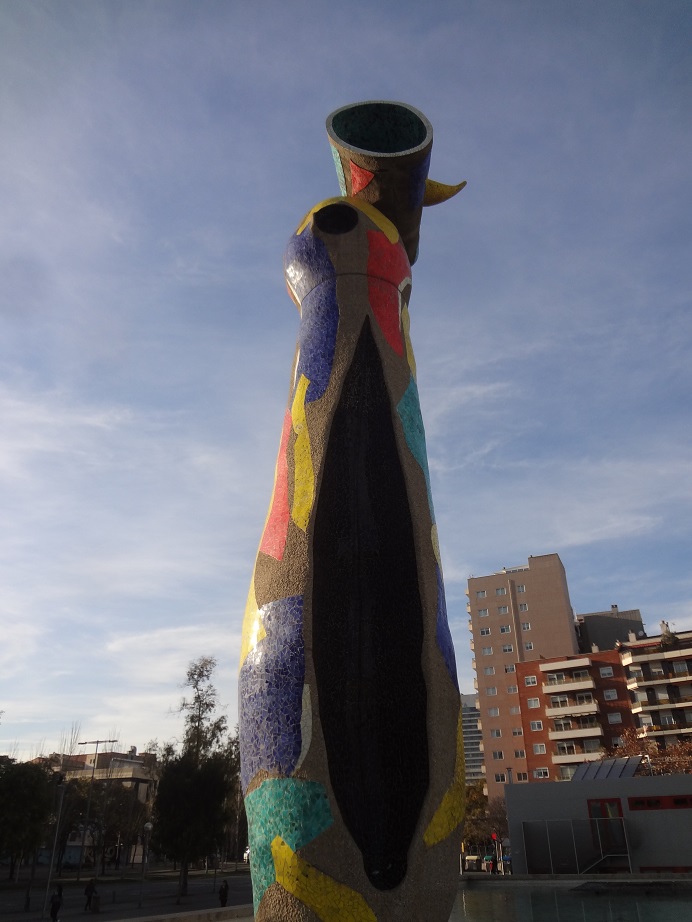 地下鉄3番線タラゴナ駅を出て直ぐ、エスパーニャ駅からは徒歩5分弱にあるジョアン・ミロ公園。巨大なオブジェが公園の真ん中に建っています。女性と鳥をモチーフにしたオブジェです。ご確認下さい。