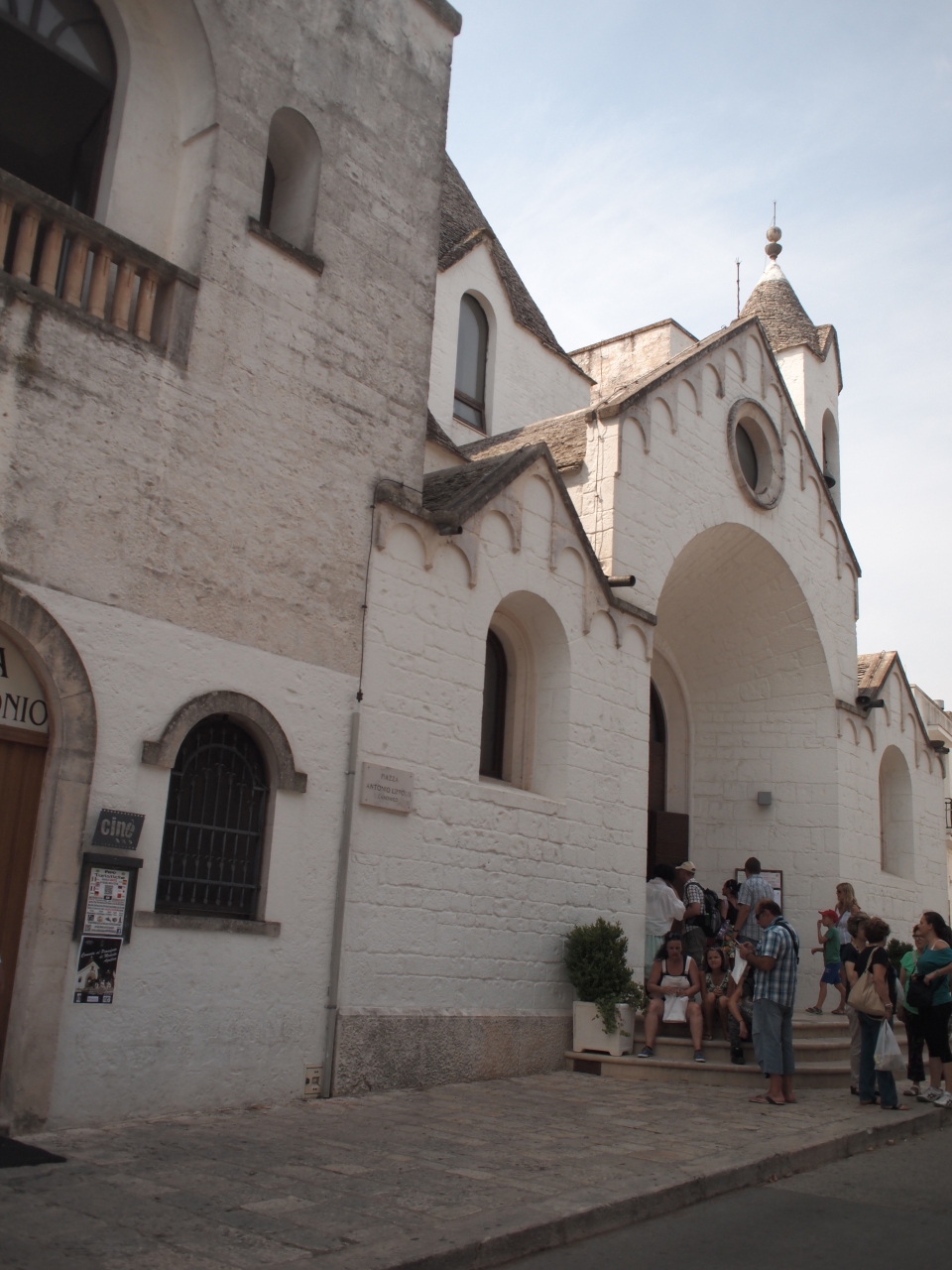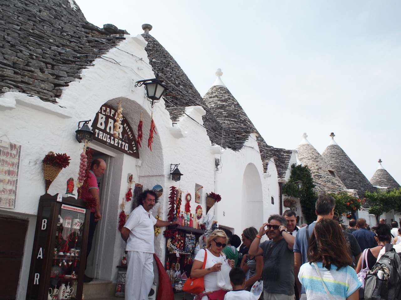 トゥルッリという独特のとんがり屋根がたくさんある旧市街西側のリオーネ・モンティ地区にあります。この辺りは道の両側に、トゥルッリの民家を転用した土産物屋がびっしり並び、皆とてもかわいい店なので、いつもたくさんの観光客で賑わっています。