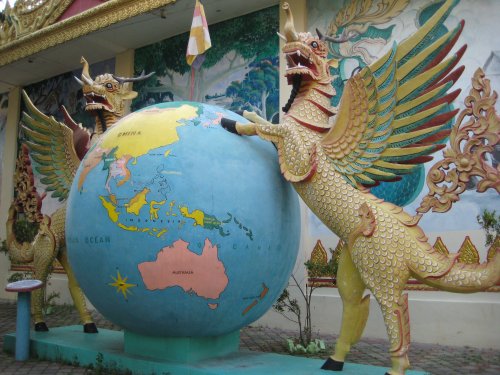 マレーシアに居ながらして、日本食レストランからのタイのスリーピングブッダに続いてのビルマ寺院観光になりました。中に入り、歩いては直ぐ立ち止り、いろいろ写真を撮ってしまう場所でした。特に気になったのが、2匹の単頭のキングギドラような像に挟まれた地球。足先を見ると、日本が踏まれています。