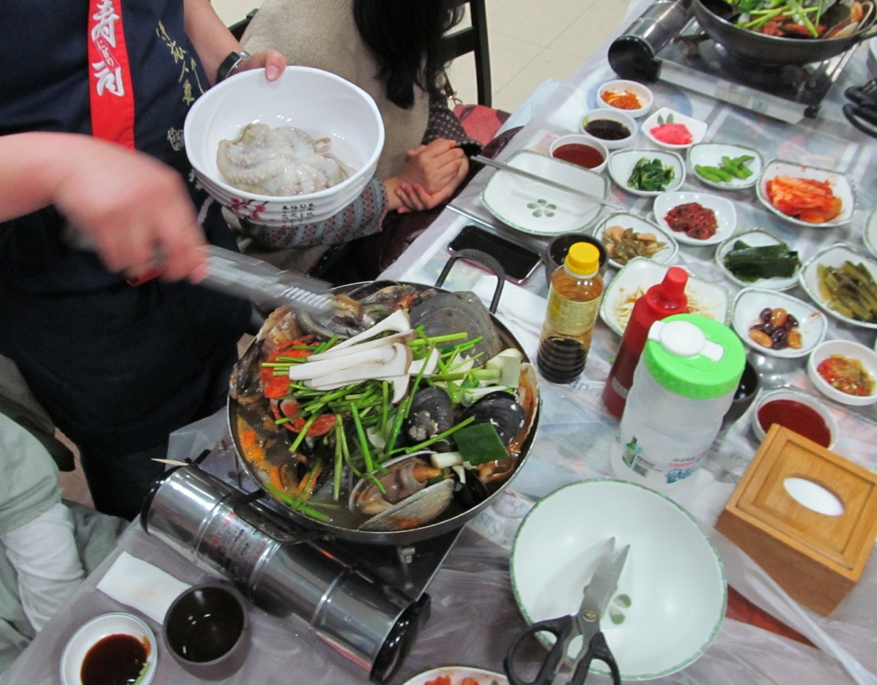 海鮮鍋には山盛りの魚介類。タコは丸ごと生きたまま入っていてビックリ!