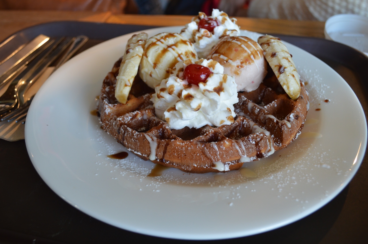 ブラウニーがおいしそうだったけど、4人で巨大ワッフルを分け合うことに。