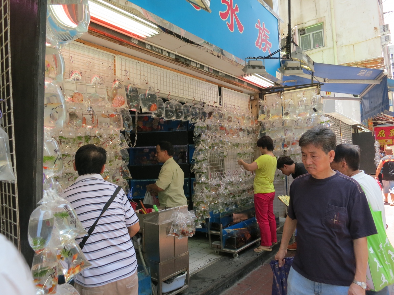店の壁面に小分けにされた金魚が色とりどりに飾られていますの、日本では見ることができない風景があるので、とてもおもしろいと思います。