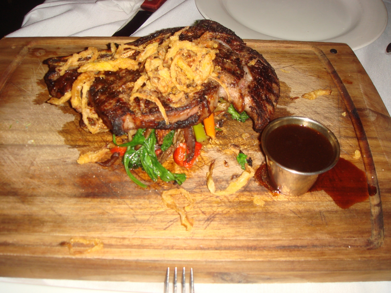 2階席に着席し、アルバータ牛のステーキとサーモン、サラダなどを注文。