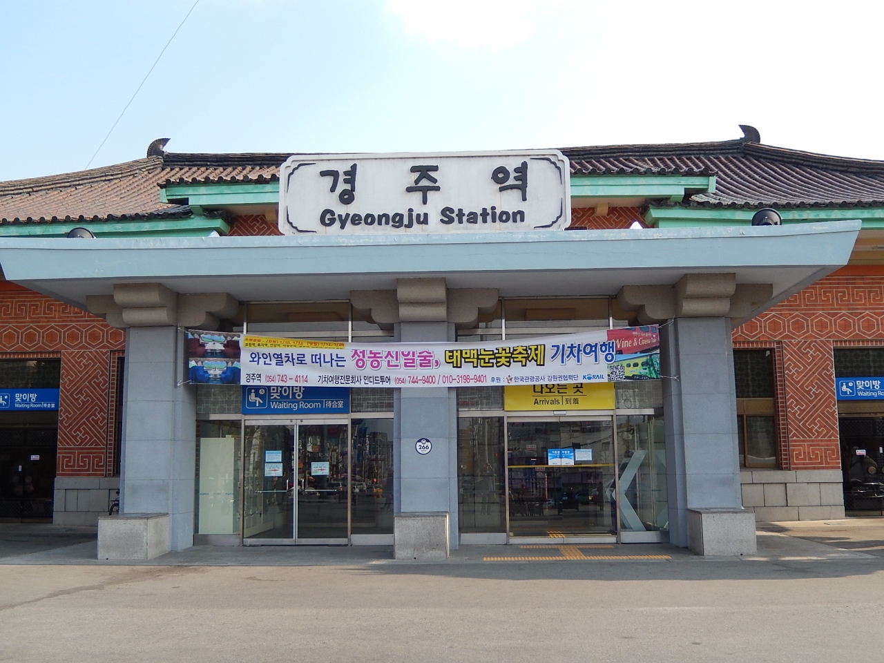 鉄道で慶州に行ったら、玄関口になるのが慶州駅。KTXが発着する新慶州駅は市内から車で約20分くらいのところにあるが、ここは市内にあるので着いたら即観光できる。駅を出たら、大通りの手前に伝統的な瓦屋根の観光案内所がある。右手には派出所もあり、ここで車でホテルへ行く道を尋ねたら、おまわりさんがパトカーで先導しながら案内してくれた。とても親切でありがたかった。