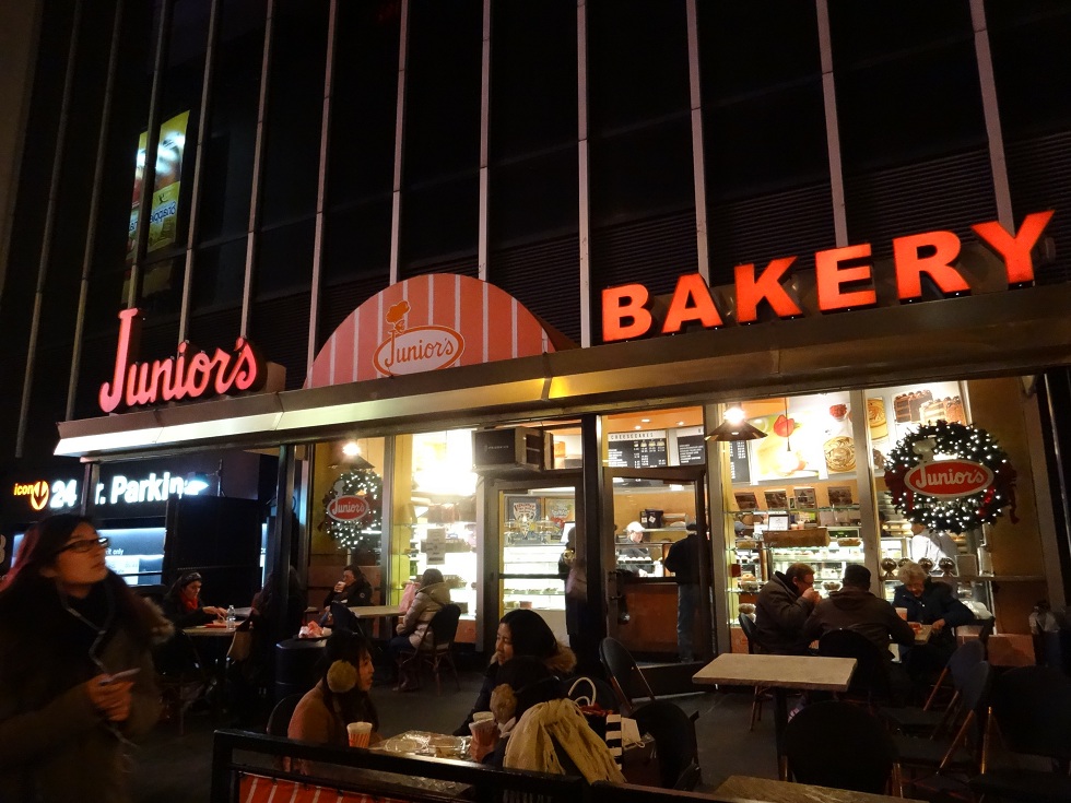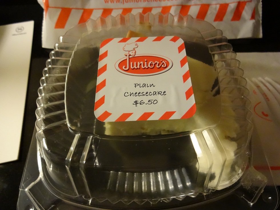 12月19日(木) 19時過ぎに、ロックフェラーセンターのクリスマスツリーを見学後、チーズケーキをテイクアウトしに行きました。手前にはライオンキングの看板がありました。ホテルに帰って中をみると、残念なことにチーズケーキは折れていました。味は普通でした。