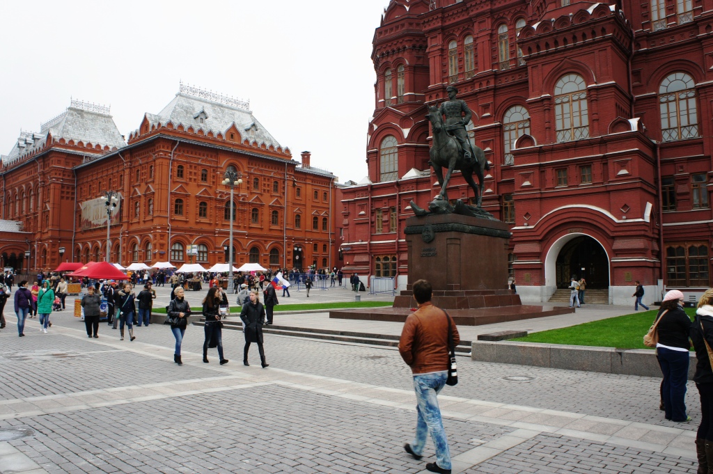クレムリンの北側に広がるマネージ広場。クレムリンの見学を経てアレクサンドルフスキーの庭園を北上すると、遭遇します。きれいに整備された広場でれんが造りの国立歴史博物館の建物が見え、いかにも観光名所の雰囲気。何だか分からないけど、着ぐるみ姿のパフォーマンスグループがうろうろしてました。かつては革命広場とか言われていたらしく、今でも都心の便利な広場として集会がよく開かれるとか。日比谷公園ってところかな。馬上の軍人の銅像が立っていたけど、誰だったのかなあ。