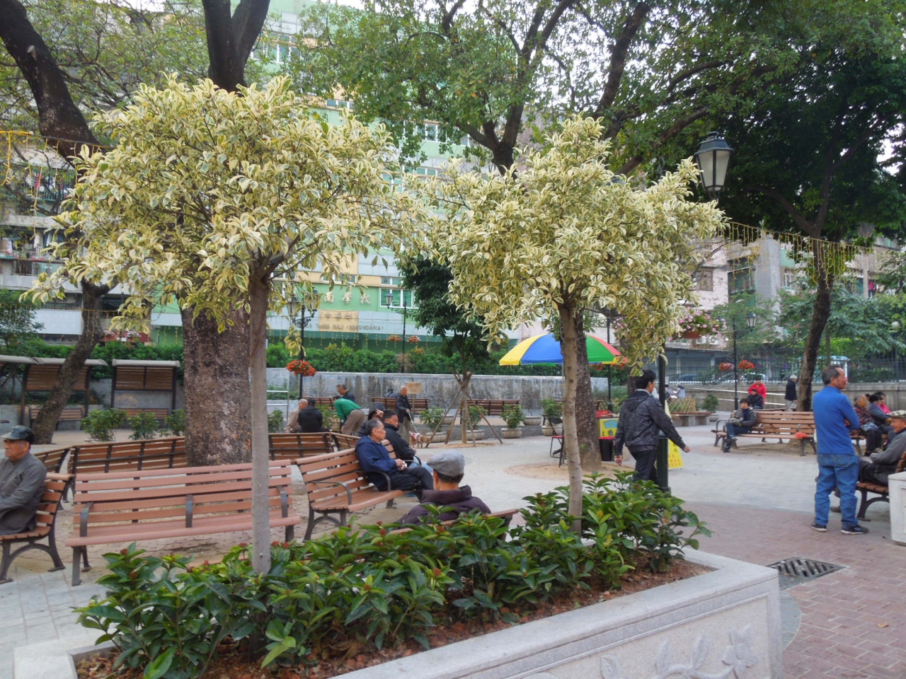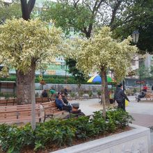 広場には観光客と地元の人が多くベンチに座って休んでいました。
