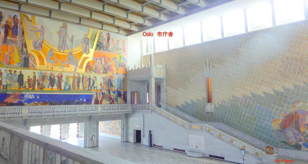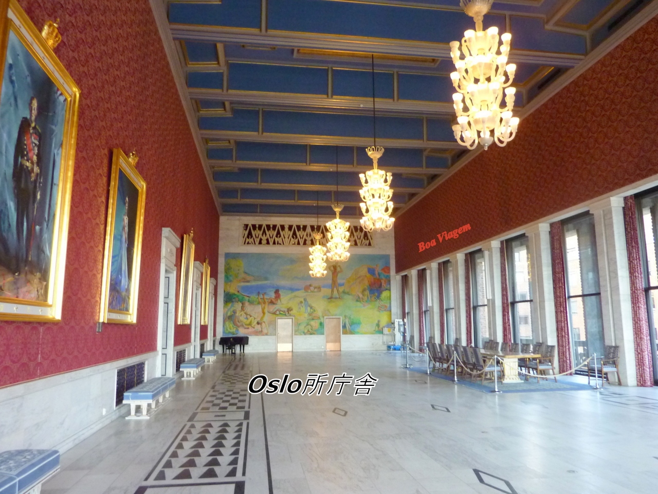 ノーベル平和賞授賞式がここで取り行われるだけのことはあります。博物館になっているノーベル平和センターにがっかりしたあとにここに来るとちょっと目を見張るかもしれません。外見は茶色の箱型近代ビルなのですが、中は城館のような調度も見られます。国賓級の迎賓に使われるだけのものがあります。2階にある国王の肖像も飾られたサロンの窓から港が見えます。1階の広いホールの大理石の床や四方の壁画は近代的であるにもかかわらず、大きく、なかなか見事!