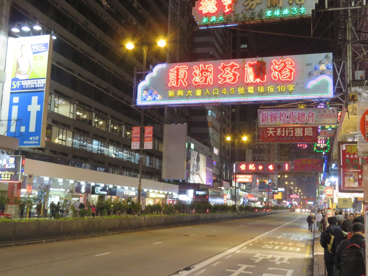 2階建てバスが走る通りですが、そのバスの高さのすぐ上に張り出した看板、その一つ一つの看板の派手さ、道の両側に並ぶショッピングゾーン、いかにも香港という風景です。