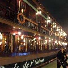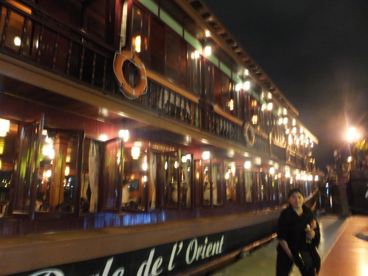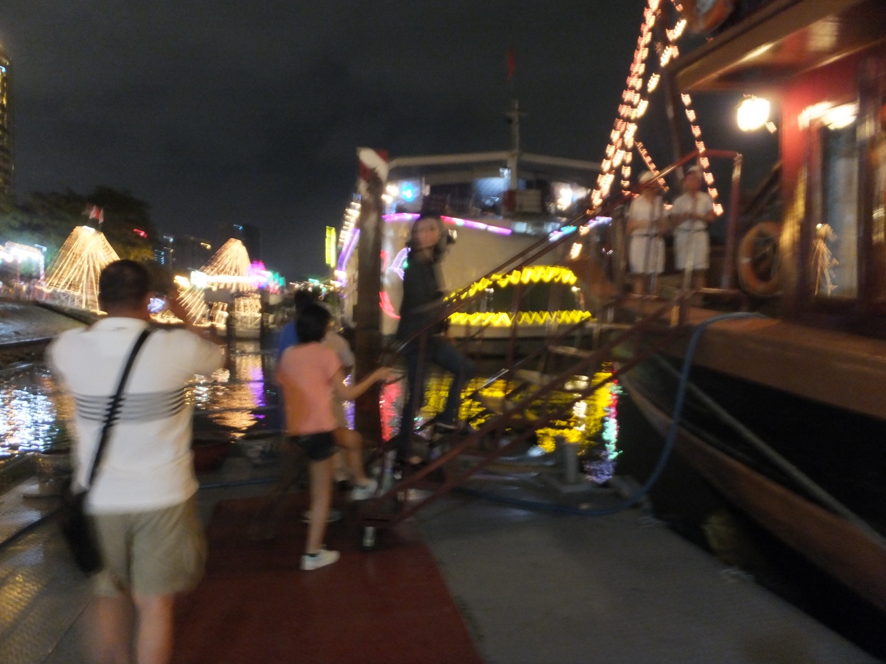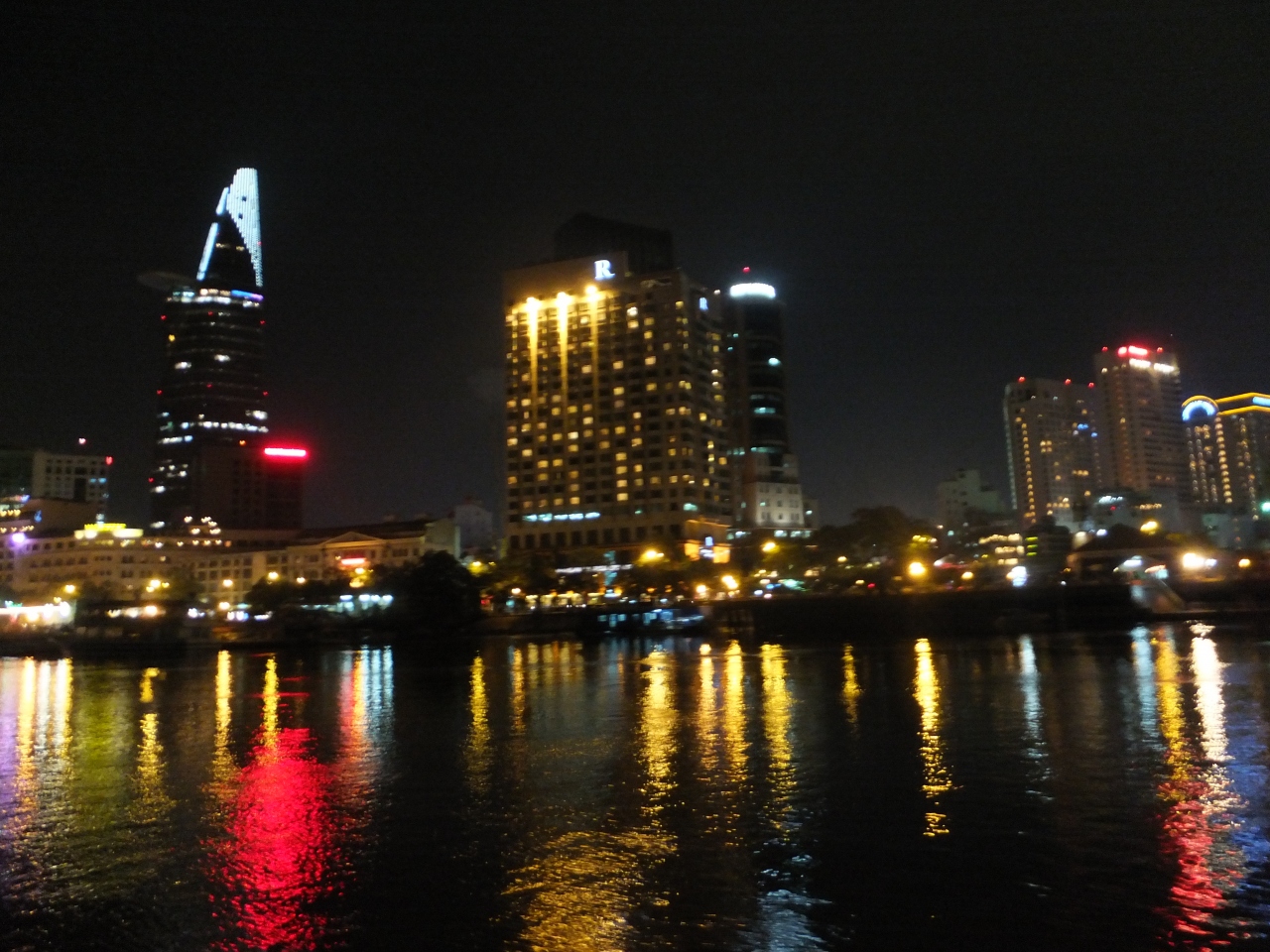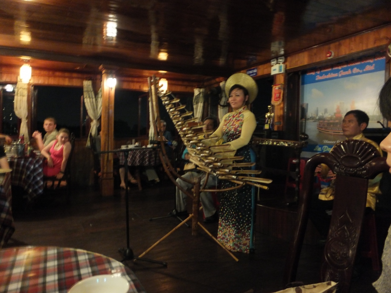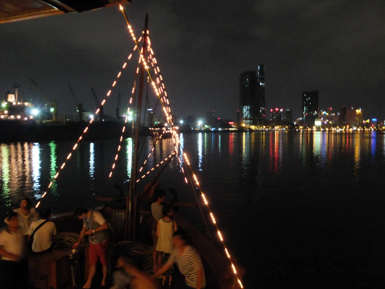 きれいに電飾された船に乗り、ホーチミンの市内を川の上から眺めるクルーズです。船内にエアコンはかかっていませんでしたので、川からの風で涼をとることになりました。ホーチミンの市内の夜景はきれいですが、船はそんなに遠くまではいかないので、よく似た風景が続きます。出航後、音楽の演奏や音楽に合わせた踊りが始まります。何人かは楽器を渡されて、一緒に演奏に参加させらます。渡される楽器はマラカスのような、簡単に演奏できる楽器です。