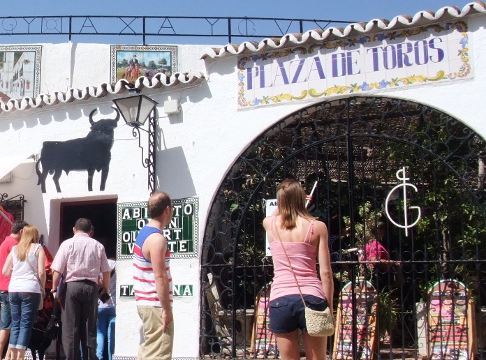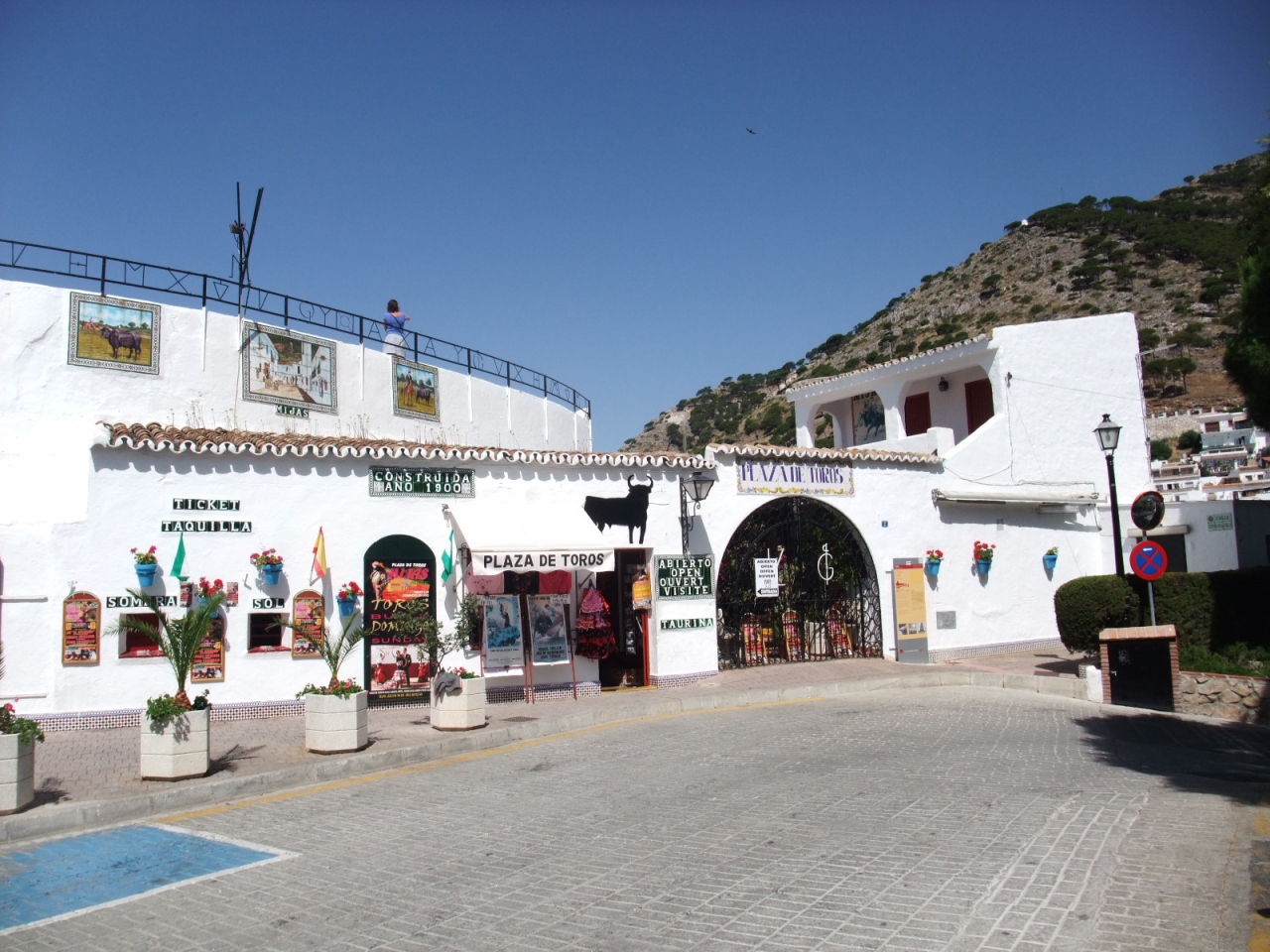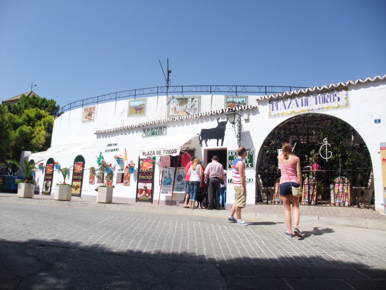 てくてくと歩いて坂道を登って行くと、憲法広場の少し上、ミハスの展望台・庭園や教会のある高台に、スペインで最も小さな四角い可愛い闘牛場PLAZA DE TOROSがあります。
