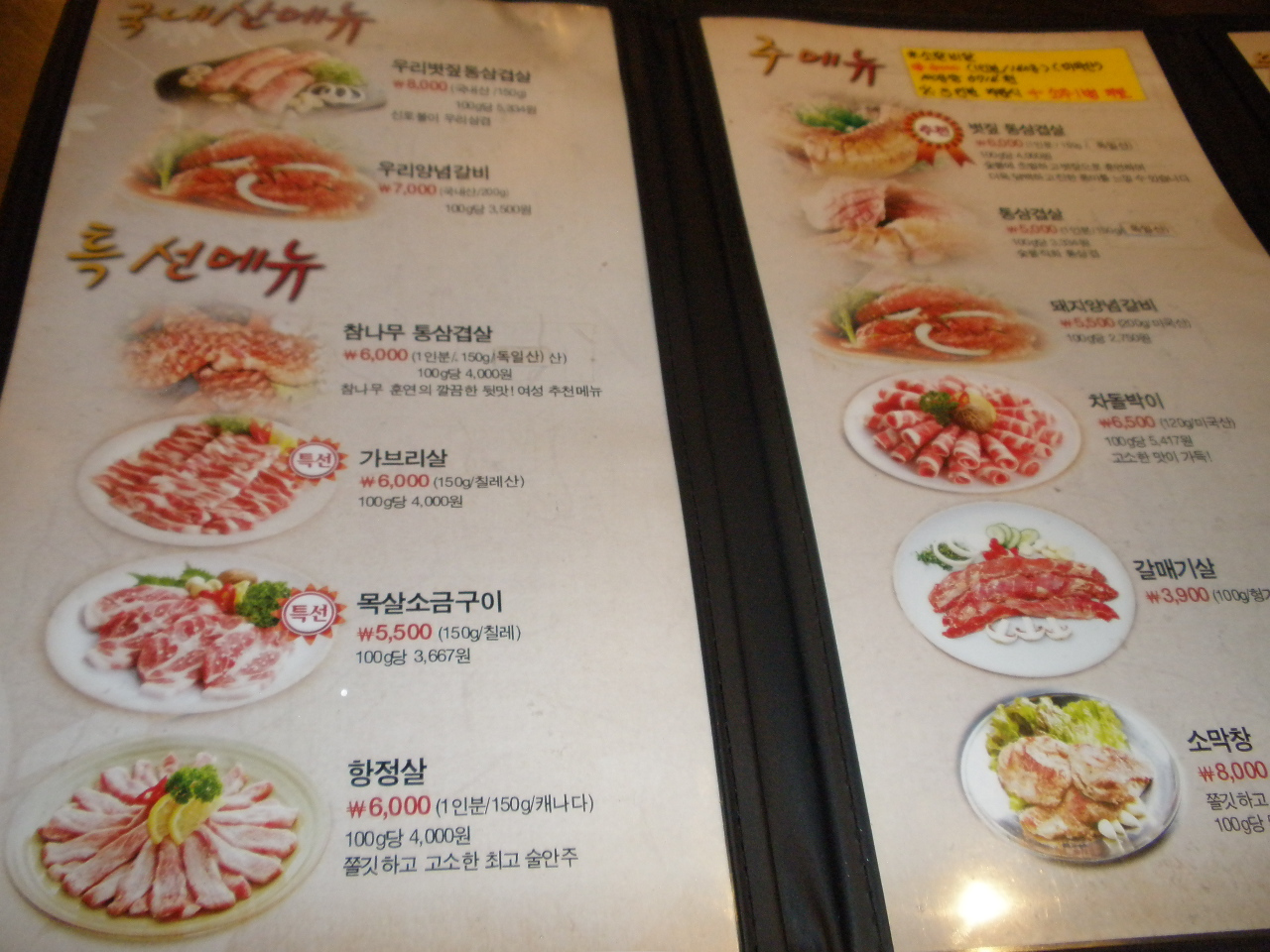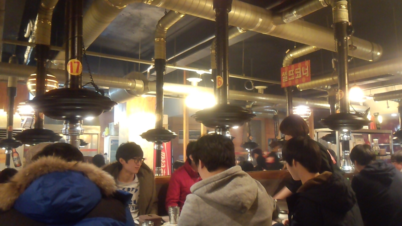 この日は、お肉お肉!ということで観光ガイドに掲載されていたお店へ。チェーン店らしく、韓国の若者が多くとっても入り安い感じ。家族連れにも最適。とりあえずお目当てだった、お弁当箱に入った具とご飯をシャカシャカ振って食べる「おさぼり弁当」と韓国産のお肉(安い方はドイツ産?だったかどこか西洋のもの)、ふわふわ卵のケランチムと瓶ビールを注文。最初、小皿のおかずを出してくれます。あとはセルフサービスで取り放題。サラダ、キムチ、コーン、プッコチなどなど嬉しい限り! 辛味噌につけた肉をキムチや味のないもやしなどと一緒にサンチュに包んで食べたり