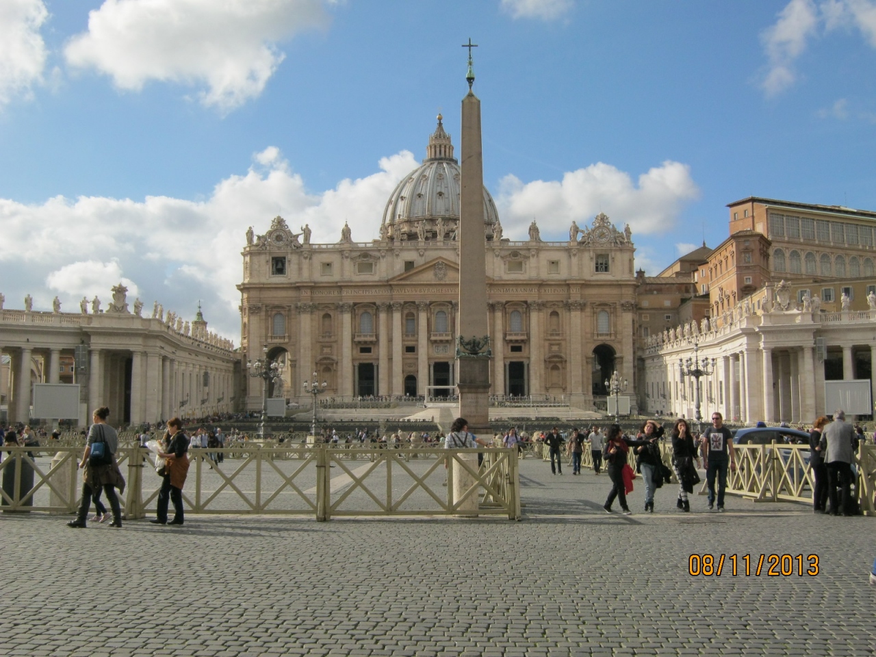 大聖堂を囲むように回廊がつくられています。左右2列に284本の柱があります。広場の中には、殉教の場所にオベリスクが建てられています。このオベリスクはエジプトからもってこられました。そしてその場所はペテロが逆さ磔されたところです。