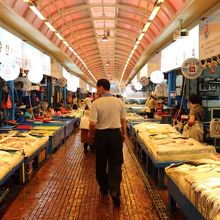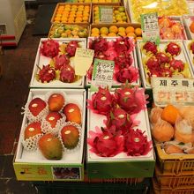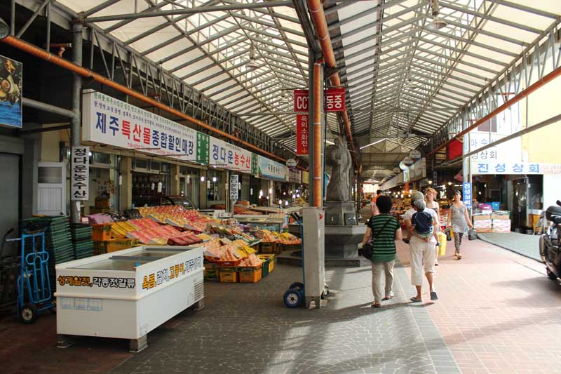 東門ロータリーのところにあります。市場の入口には、大きなトルハルバンがいて、色とりどりの果物屋さんがまずはありました。奥の方には、野菜、肉や魚などいろいろある、済州の人たちの胃袋を満たす場所かなという雰囲気です。日本では高いドラゴンフルーツを買って、ホテルで食べました。