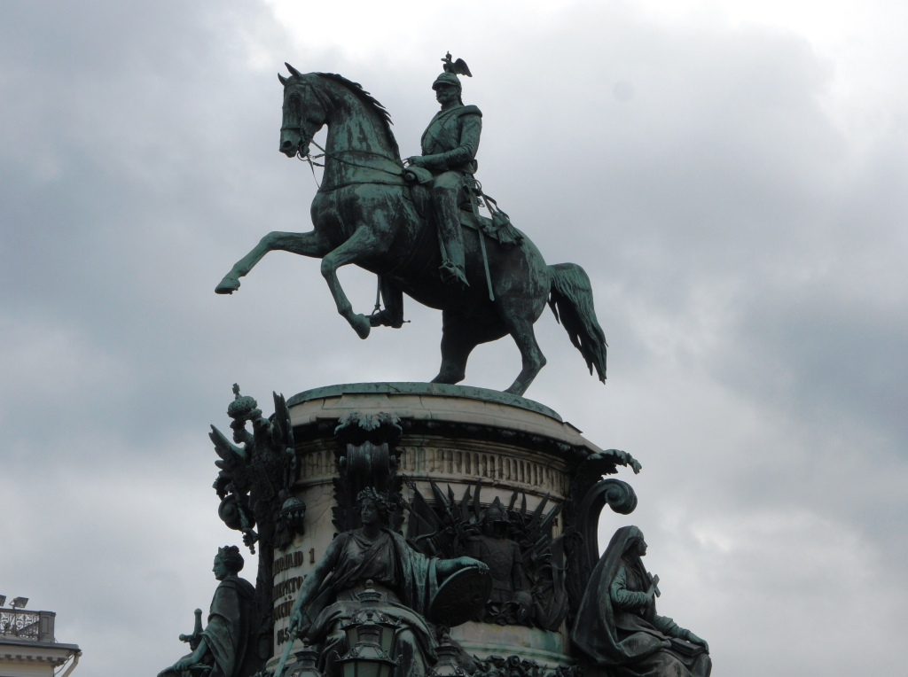 サンクトペテルブルクを代表する大寺院、聖イサク大聖堂の南側の広場中央にニコライ1世の馬上像が立っていました。馬が後ろ足だけで立っている、なかなか動きのある像です。1859年の建立。19世紀前半に即位したニコライ1世は強権的な専制政治を行い、オスマン帝国との間にクリミア戦争を起こしたほか、南下政策の中で、プチャーチンを日本へ派遣し、1855年に日露和親条約を締結しました。もう少し早ければ、アメリカよりロシアの方が仲良くなっていたかもね。銅像の周りを観光バスがとまるので注意が必要。それと、社会主義時代ってどういう扱いを受けていたのかしら。