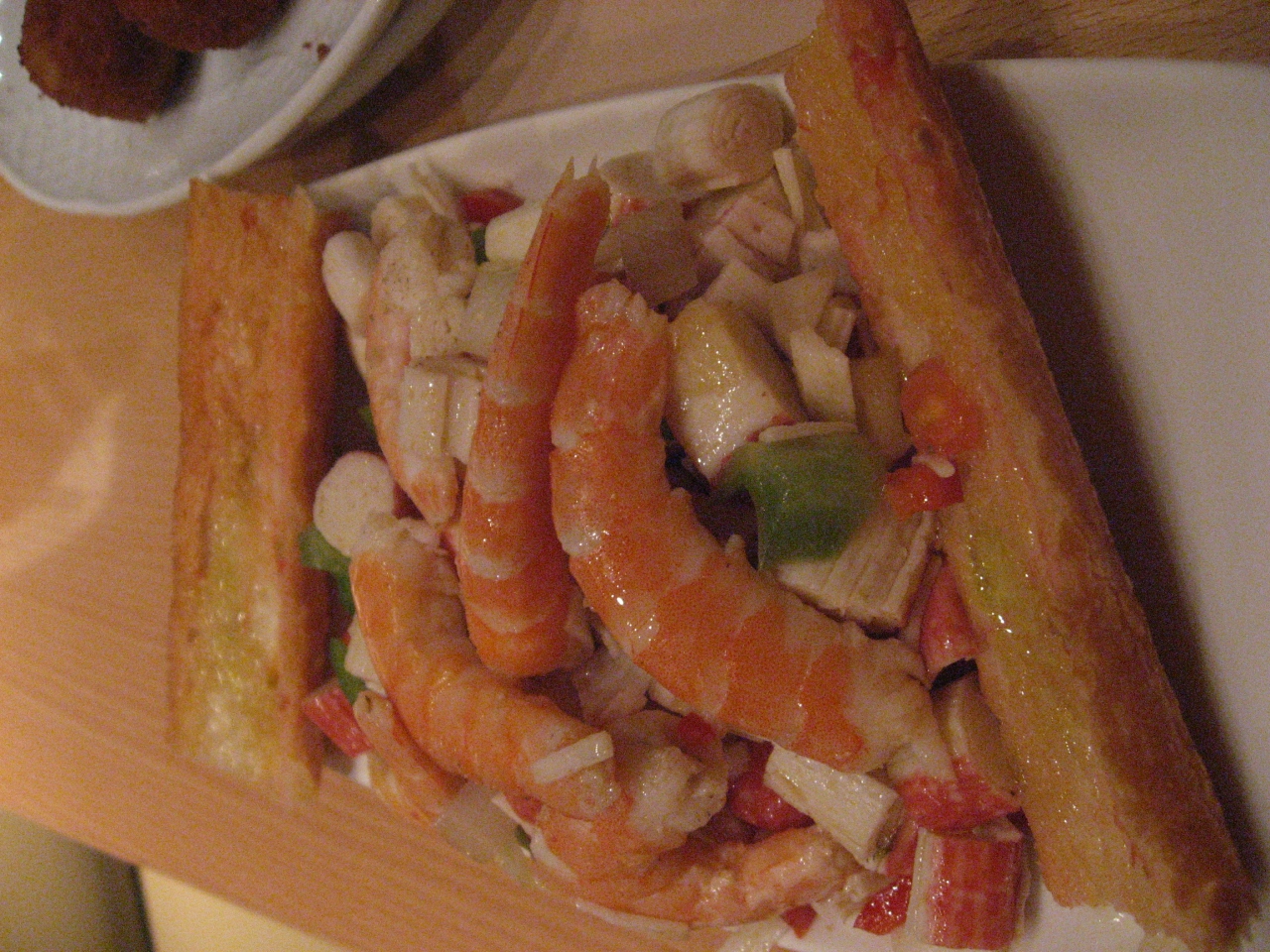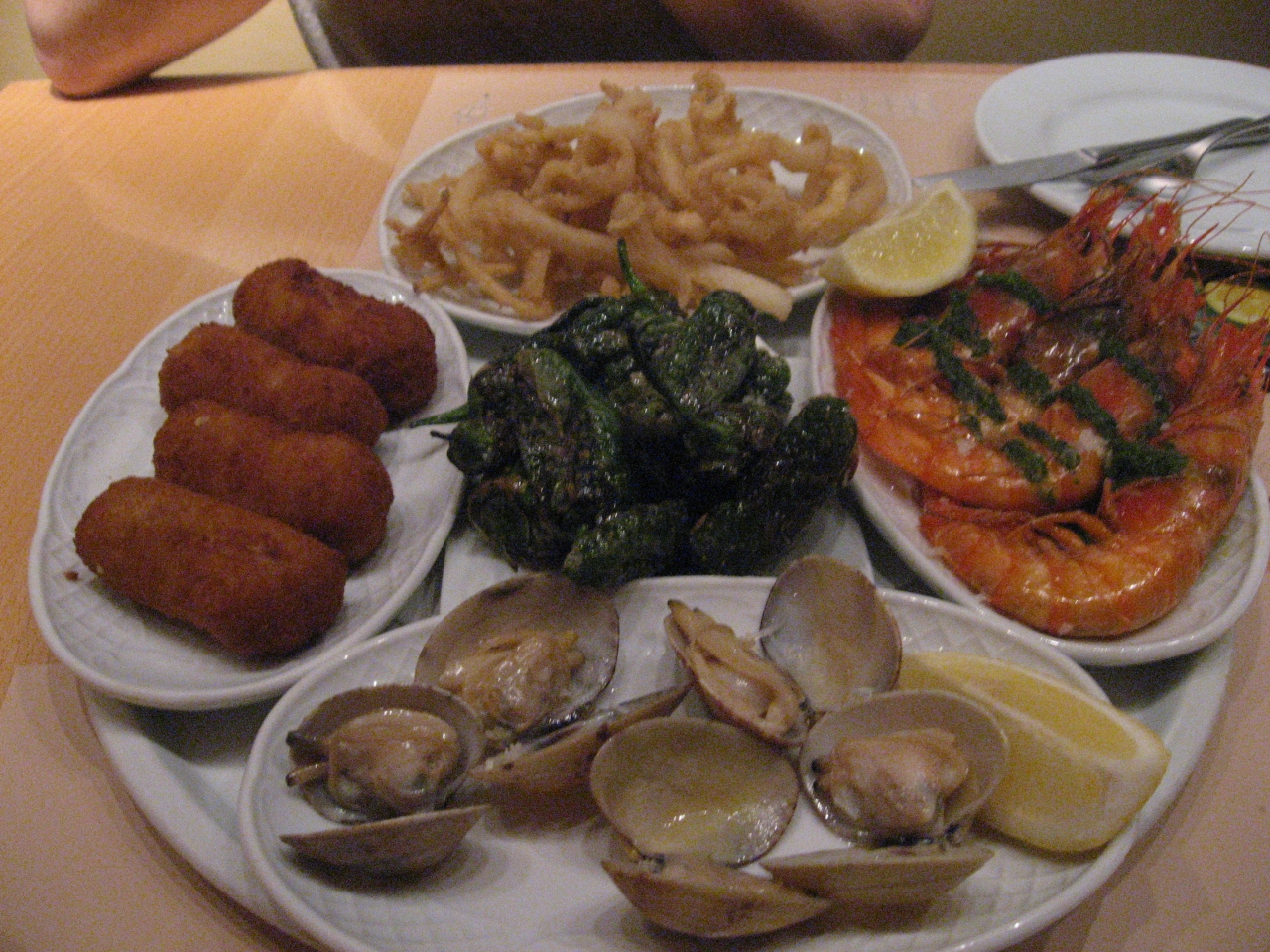 ウエーターがたまたま、ほとんど英語ができず、結局ランチの小皿セットとエビとパンの盛り合わせのような料理を注文。