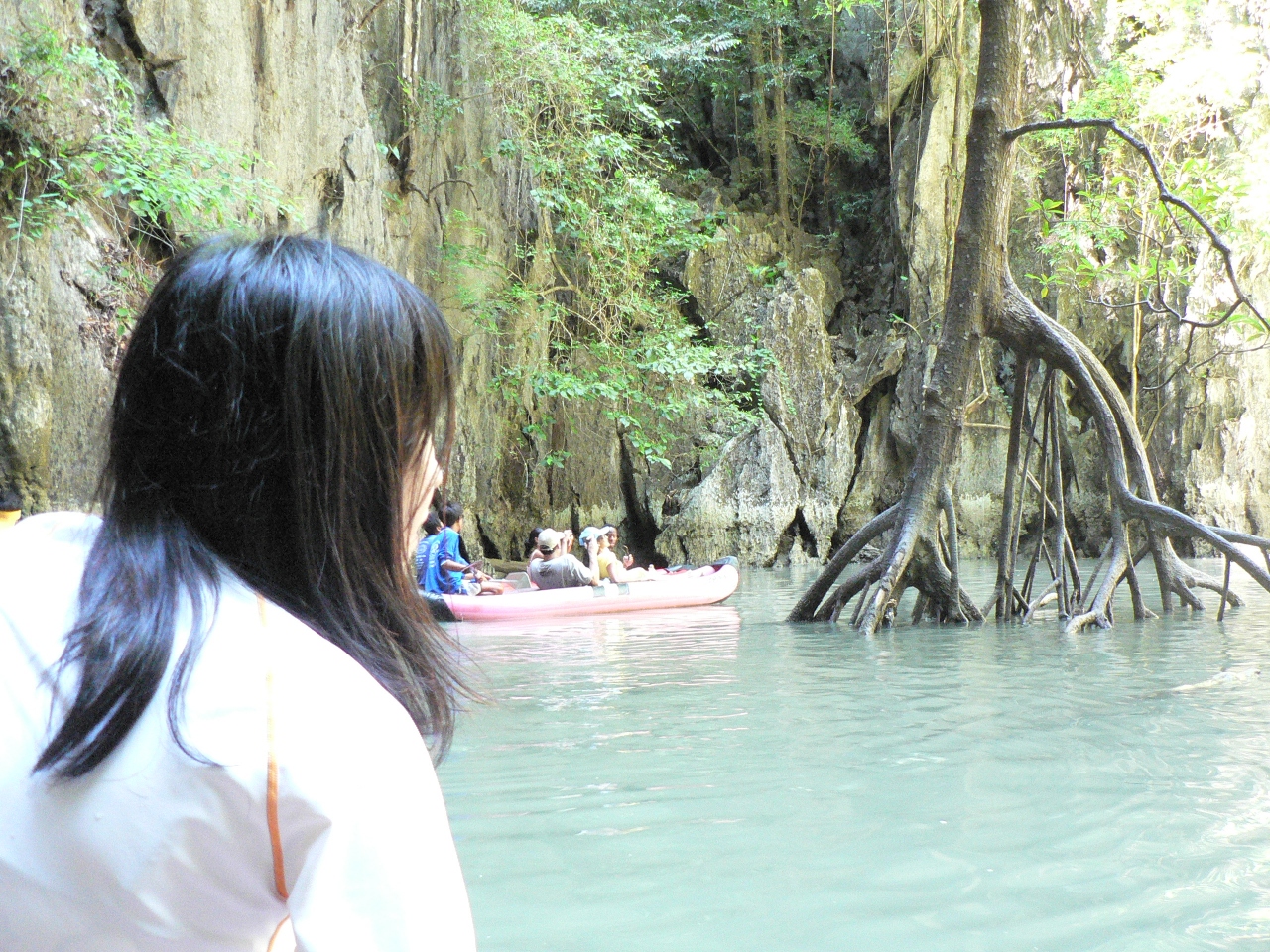 ハンガー湾で1日過ごすツアーでした。途中、ある島の近くに来るとカヌーに乗り移るようにな言われます。カヌーに乗り込むとどんどん島のほうへ近づいていき、海面と岩の間にあいた、洞穴のようなわずかなスペースへ。カヌーに座って入れる高さではないので、ねっ転がるように指示されます。ねっ転がったまま暗闇の中を進むとカヌーは島の中心の海へ。なかなか面白い体験でした。