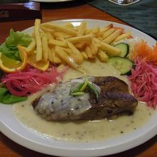 クリームソースの中にステーキが浮かんでいるという、日本では経験できない食べ方ができます。また、まわりにある野菜も漬物のような感じで、とても美味しかったですね。