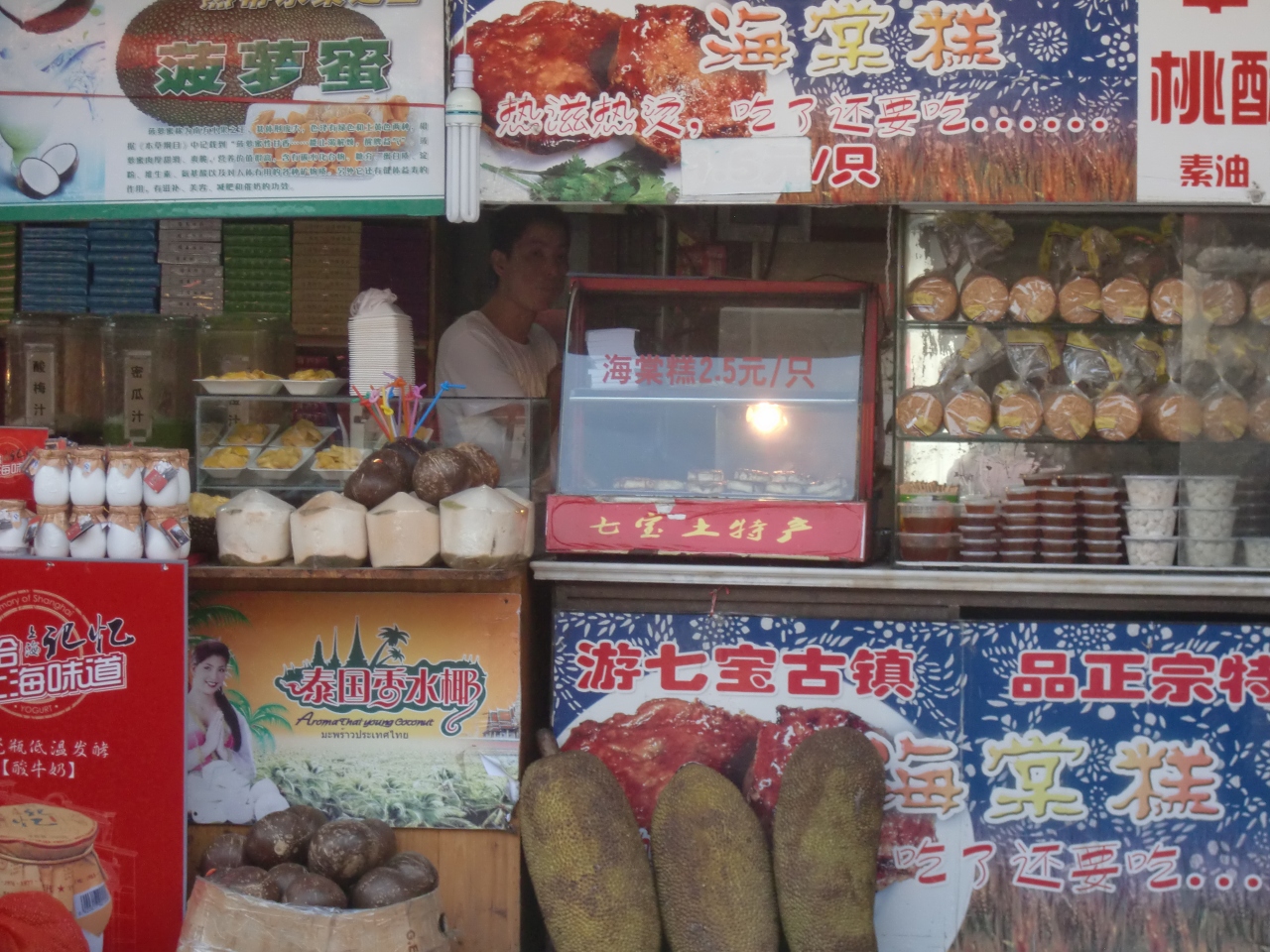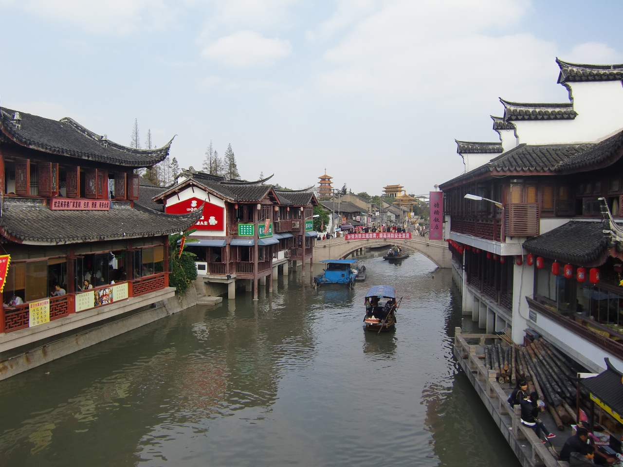 ツアーの中に組み込まれていた観光地で、ちょうど最終日空港に向かう途中の立ち寄り場所として観光しました。上海からも地下鉄を使って30分以内で行けるらしいです。そのせいか町の中を歩いていると人でごった返していました。地元の人も買い物がてら散歩に来る場所でもあるようで道沿いには屋台とかさまざまな雑貨や食べ物、お酒の店がぎっしりと並んでいました。