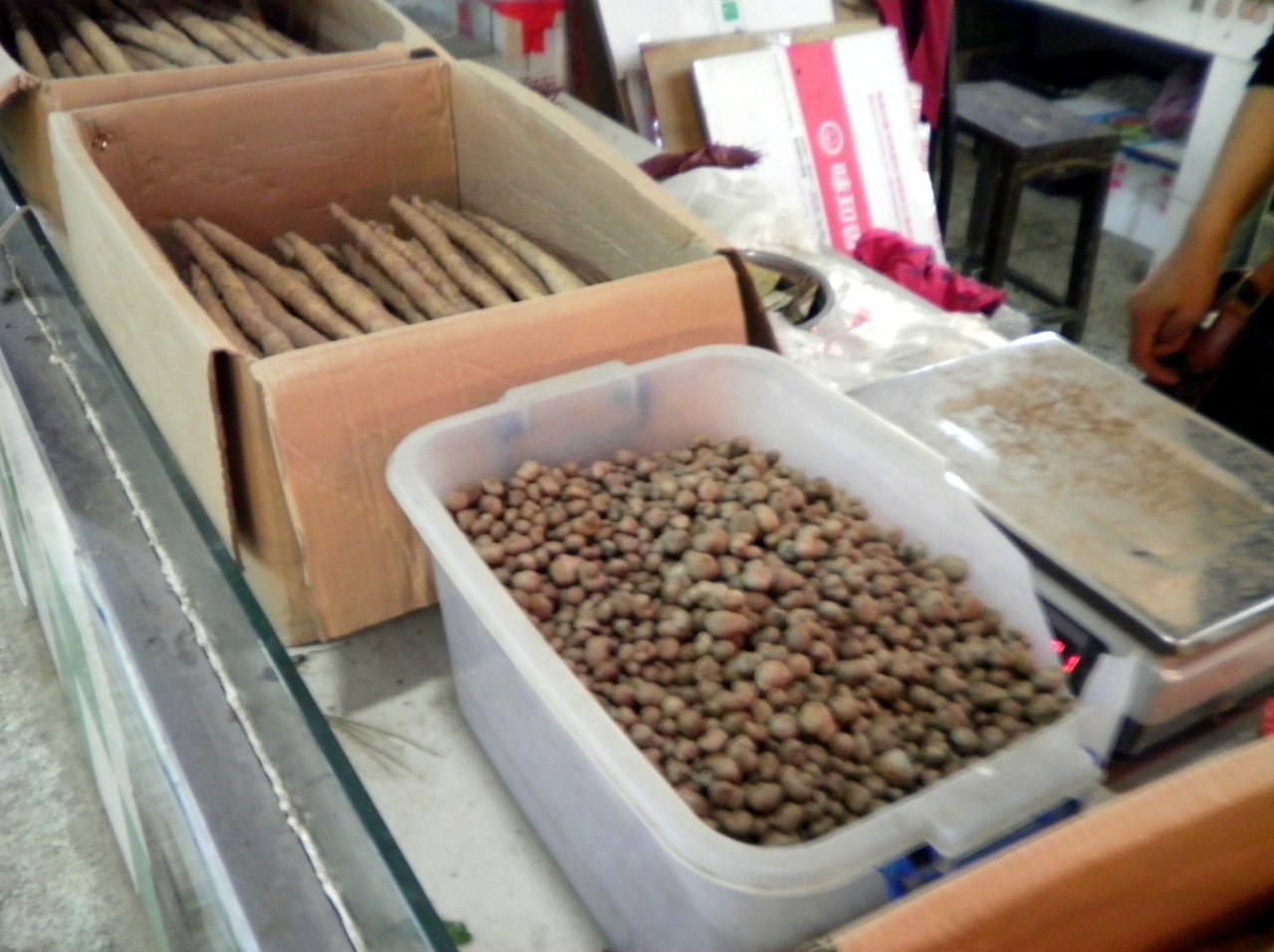 - まさに庶民の台所を満たす食材の品揃え。生鮮野菜、鮮魚、生肉、ヘビ、カエル類もあり。