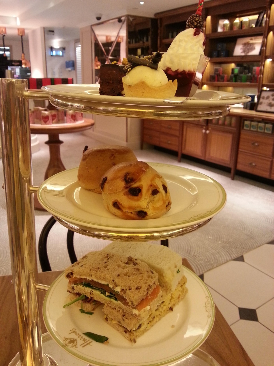 ハロッズの二階の「The Tea Room」でアフタヌーンティーを頂きました。平日の3時位はまだ空いてましたが、3時30分には満席となりました。早めの時間に行くのが良いかと思います。サンドイッチはカレー味!や日本では食べた事のない具で、楽しめました。スコーンは少しパサパサしてました。デザートは沢山のケーキの中から三種類選べます。さすがに全部食べきれず、持ち帰りました。スタッフはとても親切で、紅茶のお湯のおかわりをつねに聞きにきてくれます。一人でも、気軽に入りやすいTea Roomです。30ポンドでした。