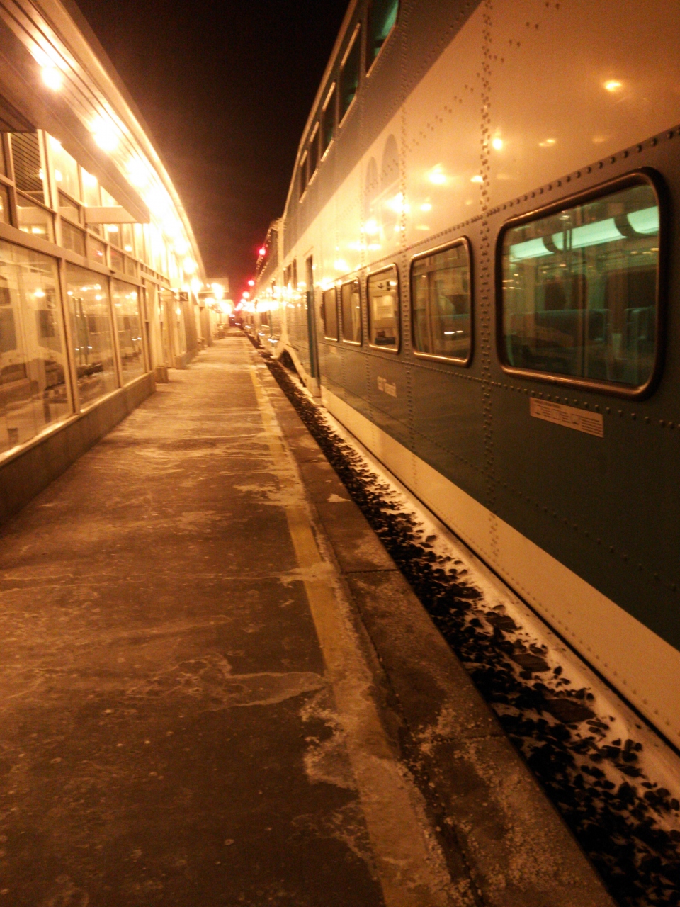 ナイアガラの滝に行きその帰りにトロントまで帰る時、バスと電車で帰ってきました。片道17ドル位で安いし安全だしお勧めです。バス代と電車代込みなので安いです。同じ会社がやっているのだと思います。電車は二階建てでいいですよ。