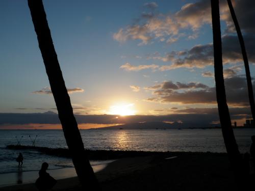 夕方、18時くらいの予約だと、まだ青い海→サンセット→日が暮れてワイキキの夜景→ヒルトンの花火、とフルコースで楽しめるのでおススメです。