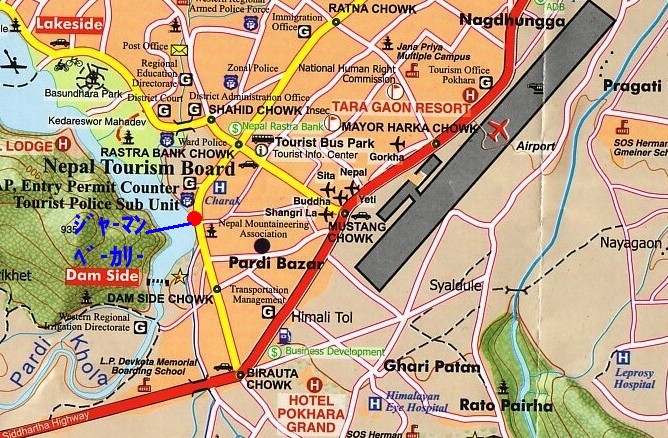 ポカラの市内バス乗り場で一番便利な場所はダムサイドのジャーマン・ベーカリー前