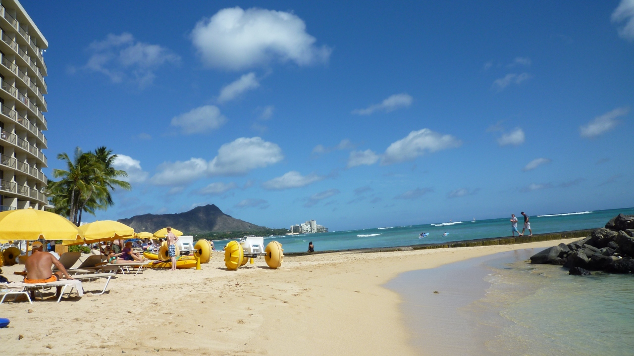 言わずと知れた有名なハワイのビーチですが、サーフボードで浅瀬を泳いでいる人もいるので、子供連れの海水浴には気を付けて下さい。海の水は思ったより澄んでいない感じがしました。遠目から道沿いに眺めると絵に描いたように真っ青な美しさです。そばには露店で軽食も食べれる設備も有ります。日本の海水浴場と大差ない感じです。