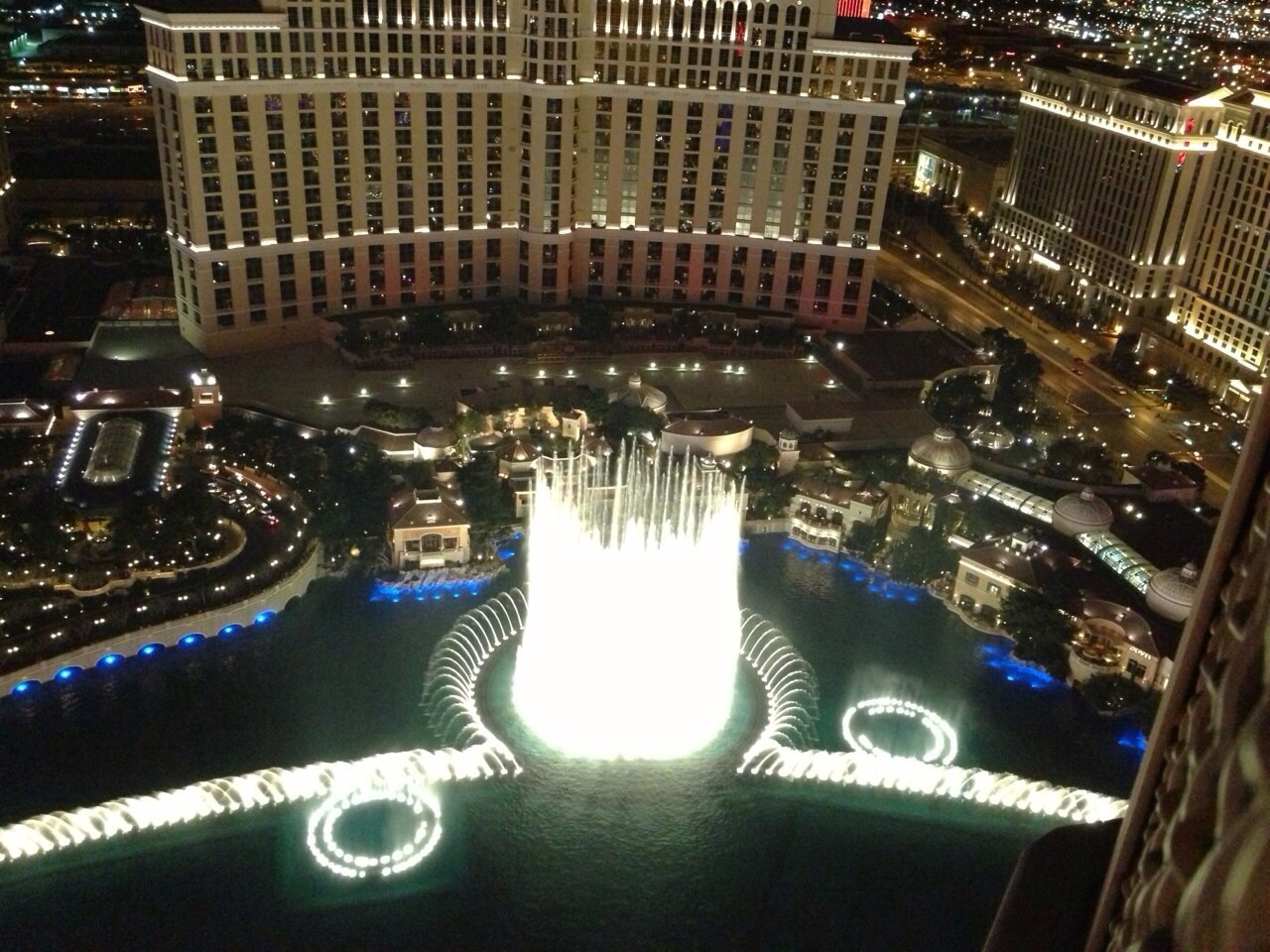 15時からはじまり、夜の18時をすぎると15分おきに音楽や光の違う噴水ショーが無料で見れます。ベラージオ側からエッフェル塔と見るのもよし。エッフェル塔側からホテルと見るのもよし。色々なパターンを試しましたが、私の一番のおすすめは写真にあるエッフェル塔の上の展望台から眺めるのが最高でした!