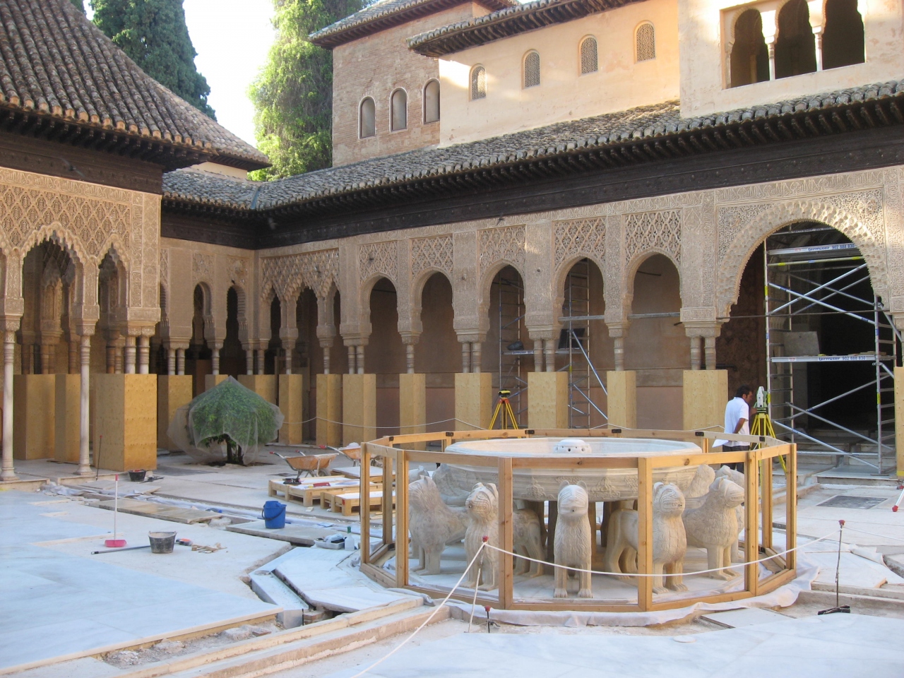 アルハンブラ宮殿に行く前に事前情報収集でテレビ番組などをよく見ていたが、その折りこのライオンの中庭のことも放映していたので楽しみにしていたが、私たちが訪ねたときは、ちょうど修復中でカバーが掛けられていたので残念だった。