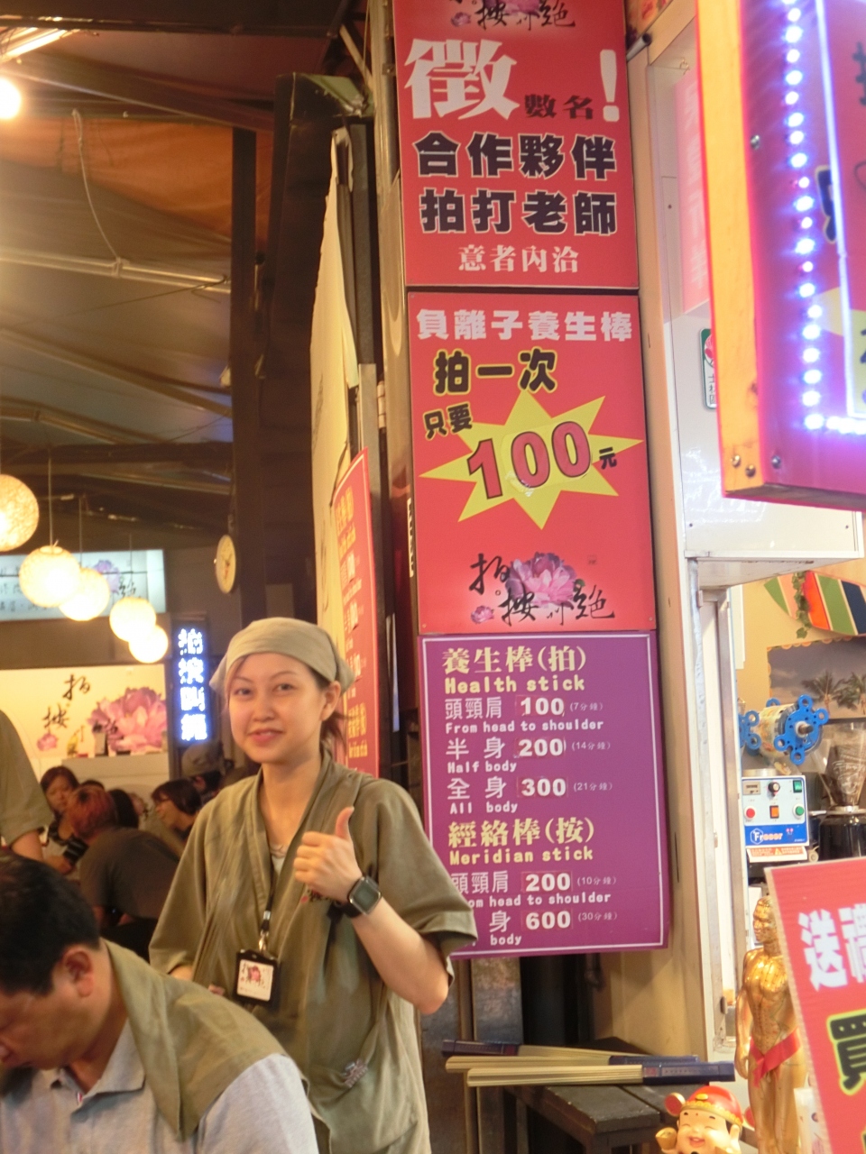人混みに疲れたら、はりせんみたいなものでバンバンたたくマッサージもあり、思ったよりすっきりするようでおすすめ。