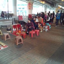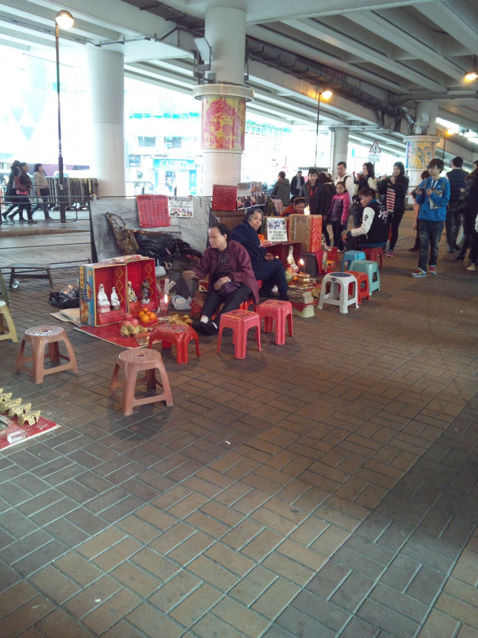 タイムズスクエアの近くの高架下で「打小人」というお祓いがやっていますと聞いて、ちょうどコーズウェイベイ周辺に来たので、ちょっと立ち寄ってみました。お昼時間なのか、閑散しています。一組のお客さんしかいませんでした。お客さんの友人と見られる二人はビデオを撮っていて、おそらくお祓いより異文化を体験するためお祓いを頼んだではないでしょうか。とりあえず、人通り多い繁華街なので、見学だけでも、居づらいです。もし、お祓いを頼む必要があっても、物見される覚悟がないと!