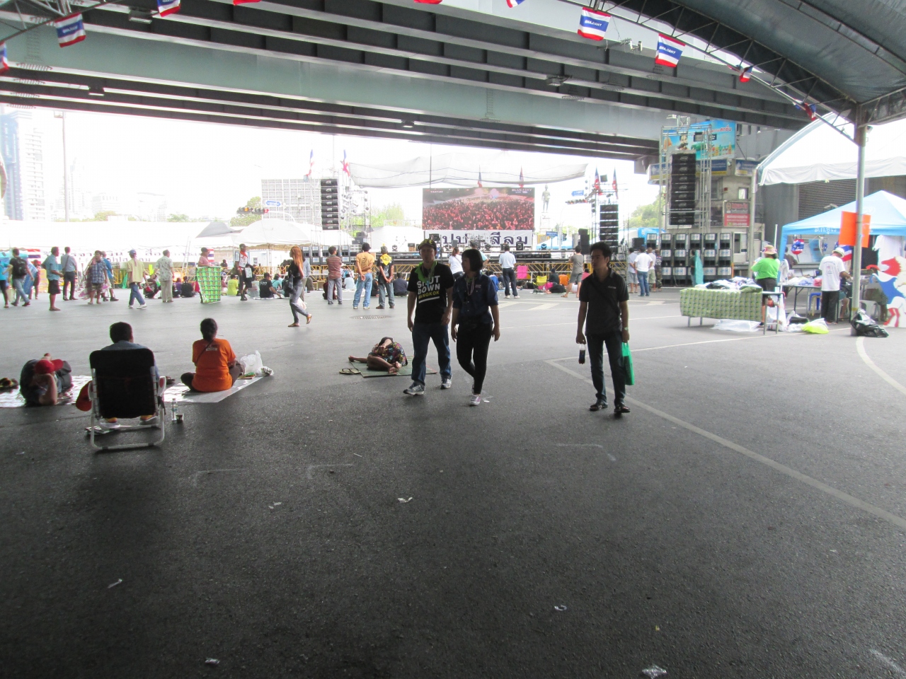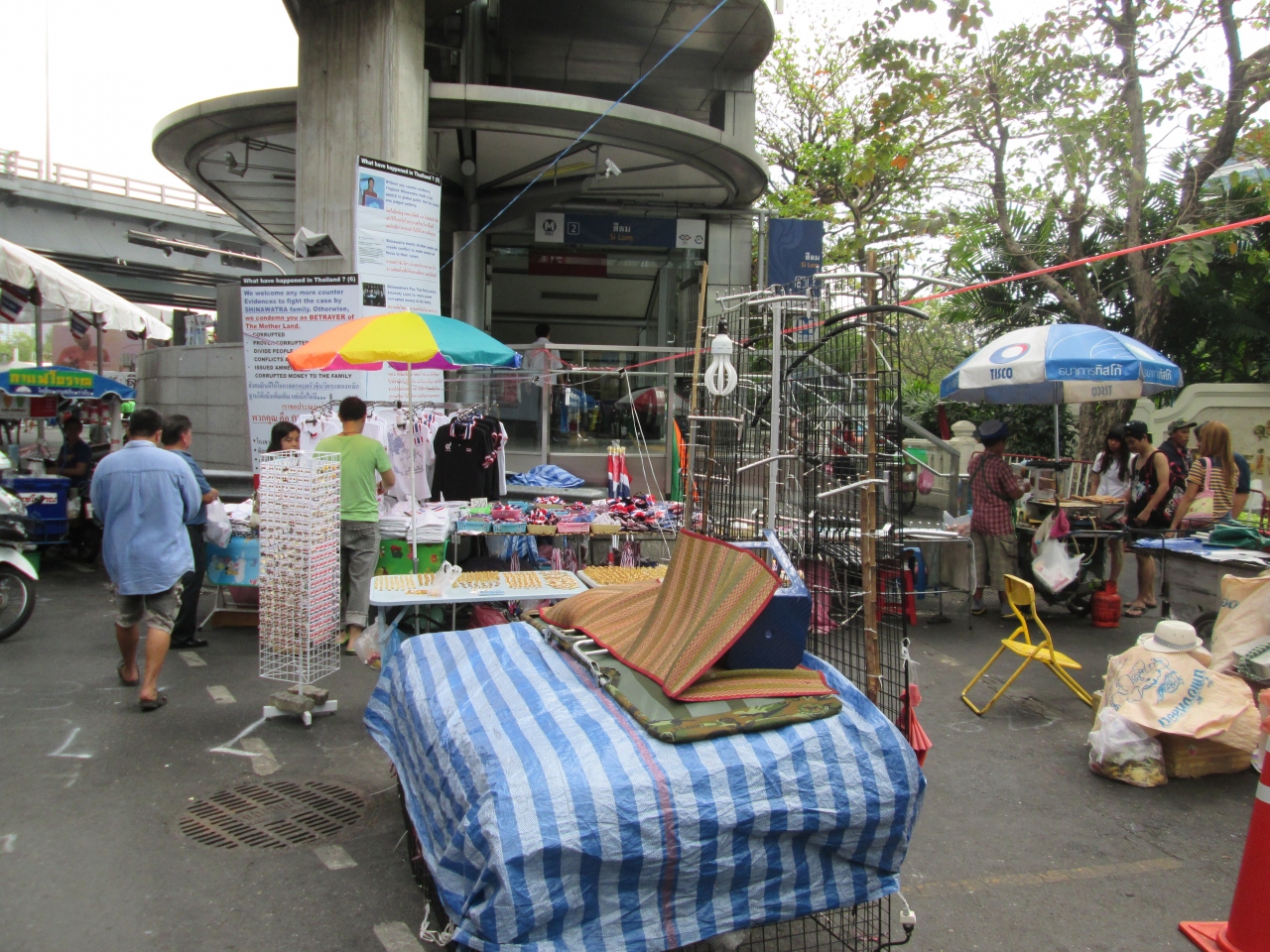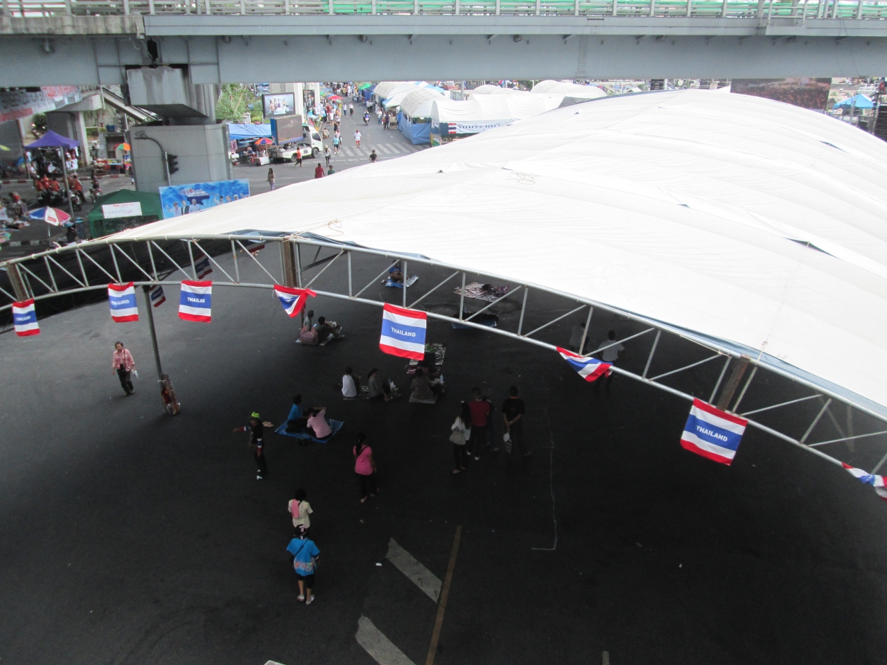 1/13以降、反政府のデモ隊が駅周辺の道路を封鎖しており、原則、車は通行できない状況です。駅前の交差点には大きいテントが張られており、ステージが出来ていました。周囲には露店、屋台が出ています。MRT自体は通常運行しています。