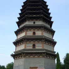 正定県には4つほど古塔が残りますが、これはその内の一つ。古代中国の唐の時代、9世紀に建てられ、八角形をした塔の上層9層付近が、流石に1000年の間の風雪や地震により損壊が進み、1982年に大規模修理が行われたとのこと。何か窮屈そうに首をすくめている姿にも見える古塔です。
