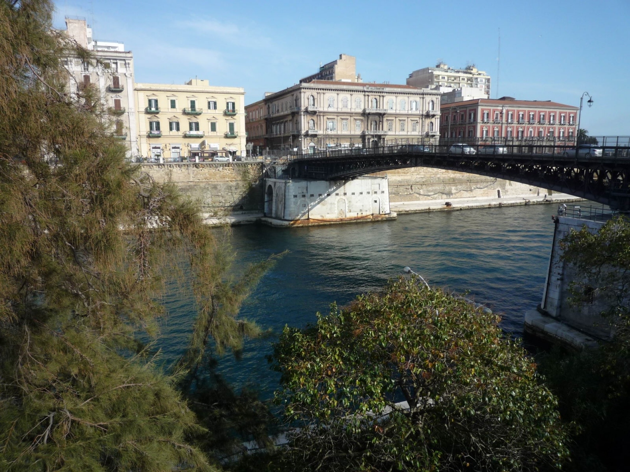 外洋マーレ・グランデと湾になっているマーレ・ピッコロの間の島に旧市街があり、外洋と湾を結んでいるのがナヴィガービレ運河。