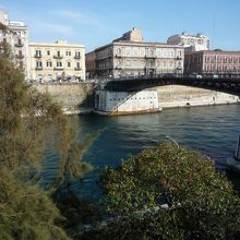 運河のそばにある城塞はイタリア海軍の施設で、湾内には軍艦も停泊しています。
