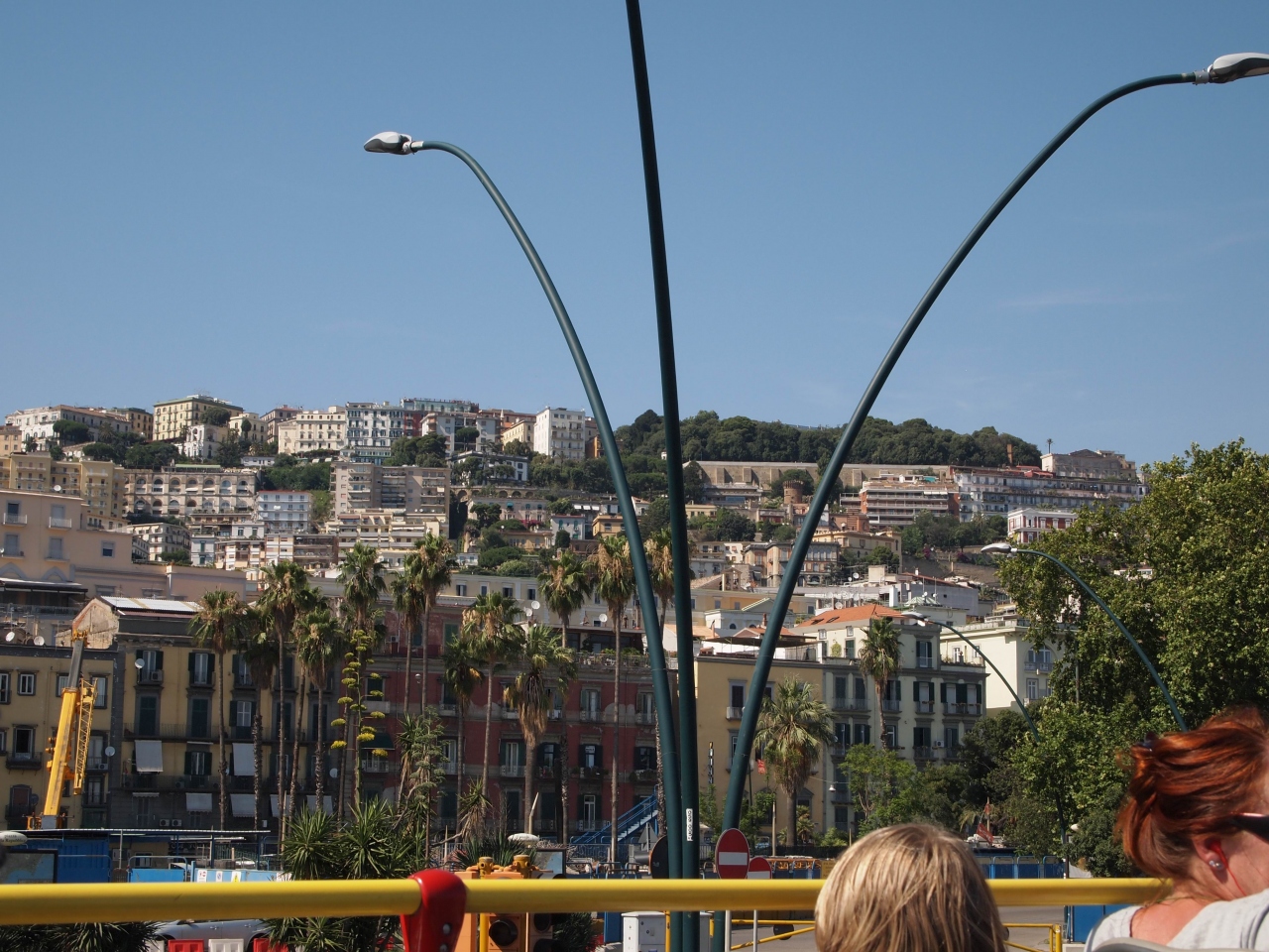 一番のおすすめはポジリポの丘へ行く路線です。帰りに見晴らしのいい場所で写真のための停車をしてくれます。港とベスビオ山の絶景を見ることができます。あと、カポディモンティ美術館へ行くルートもナポリの高台を登って行くので、ナポリの町を奥から一望できます。少し高い場所からナポリを見ると、狭い路地や人々をゆっくり観察できたり、観光スポットや駅、バスターミナルの場所を確認できたりします。個人で旅行しているので日本語の説明があるのが最高です。