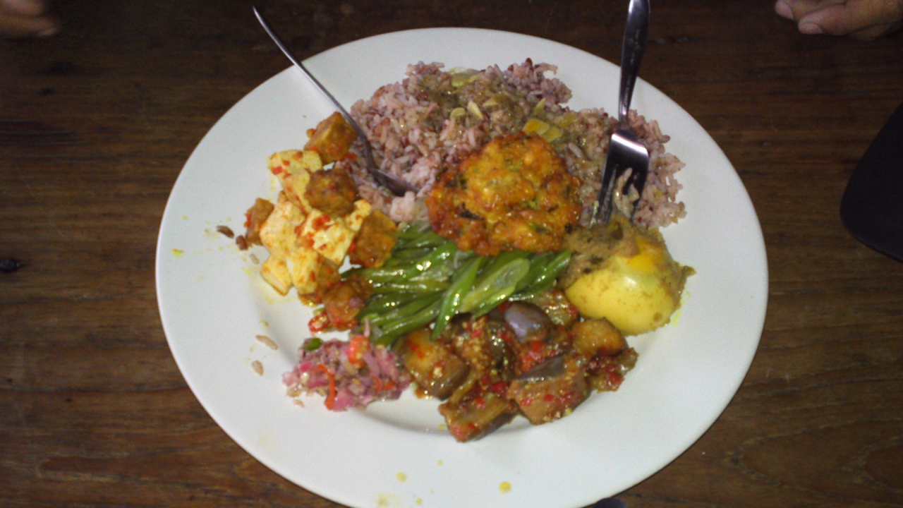 料理は、ガラスケースに入った惣菜を自分で選んで載せるナシ・チャンプルがお勧めです。ご飯も白ご飯と赤ご飯を選べます。