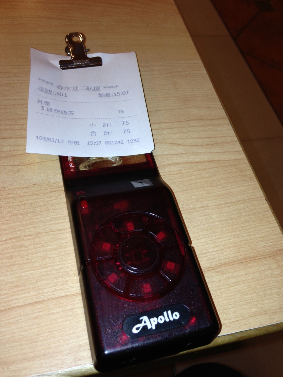 帰国時だと慌ただしくて飲み損なうといけないので、到着したら、まず春水堂でタピオカミルクティーを飲む、と決めていたのに、すっかり忘れてしまいました。案の定、帰国の際には予定より遅い空港到着となってしまい バタバタで買いに走りました。幸いお店は空いていて、すぐ注文できました。タピオカミルクティーのショートサイズで75元でした。その場ですぐ作ってくれるかと思いきや、呼出ベルを持たされて待つコトに。いつもならとっくに出国を済ませ免税店でウロウロしている時間帯なのに、エアサイド外に居て、出国手続きにどのくらい時間がかかるか不安で、さらには連れも待たせていたので、1分1秒が惜しい心理状態でした。3分ほど待っても出てこないので、レジ係りの人に、急いで欲しい旨伝えました。2ミニッツと言われ、結局5分ほど待ってありつけました。液体物なので手荷物検査前に飲み切らないと勿体無いと思い、ゆっくり味わって飲むコトはできませんでしたが、上品な甘さのミルクティーとタピオカの食感が最高です。こちらのお店ではすべて紙カップで提供している様なので、雰囲気も楽しみたい方は市内の店舗の方が良いと思います。