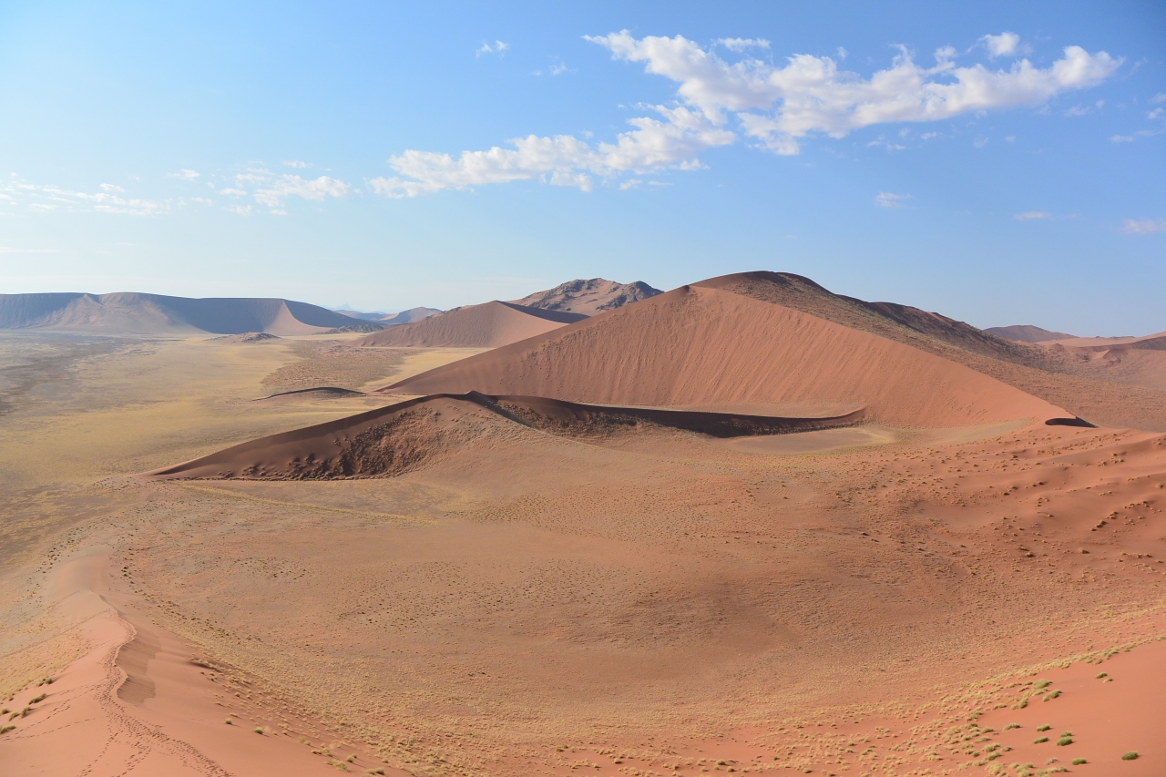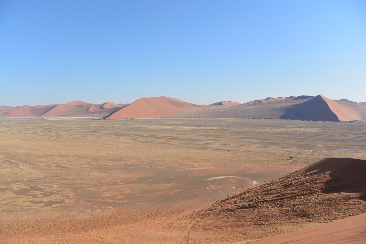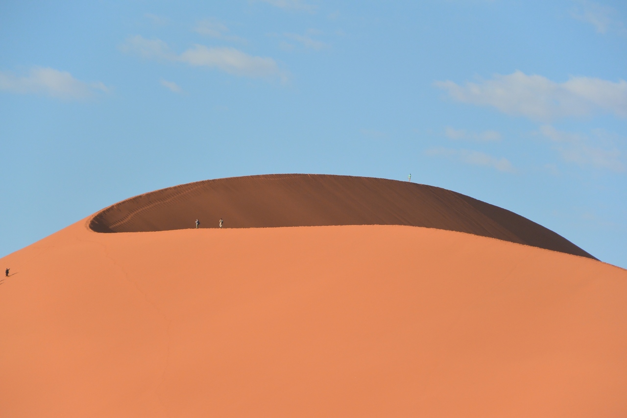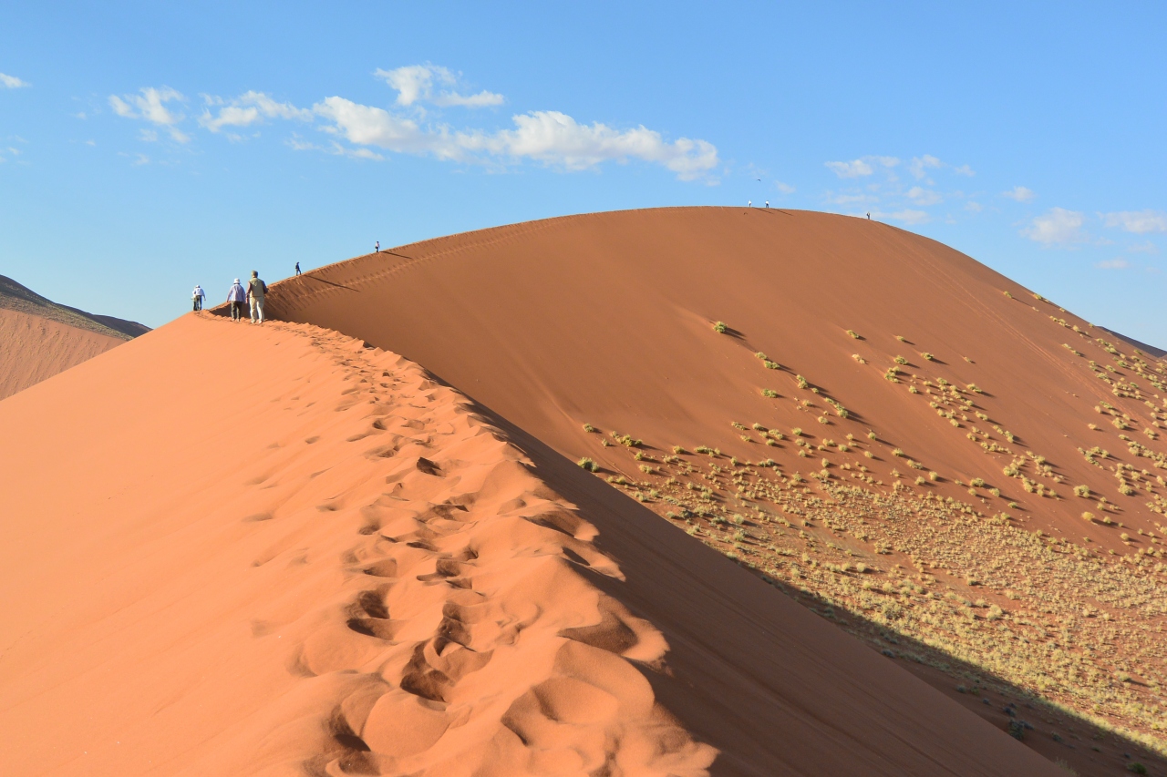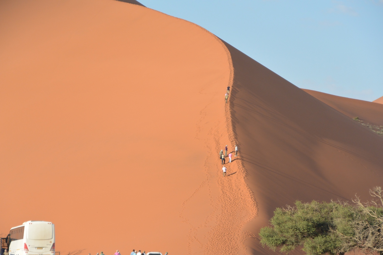 デューン45までぜひ行って欲しいし、行ったらぜひ頂上まで登って欲しいです。頂上からの眺望は最高です。登りは3歩進んで2歩下がるみたいなまるで何かの歌詞のようですが、ズルズル滑り歩くのが大変ですが、30分あれば頂上まで行けます。ナミビアの赤い砂を存分に味わうことができる場所です。