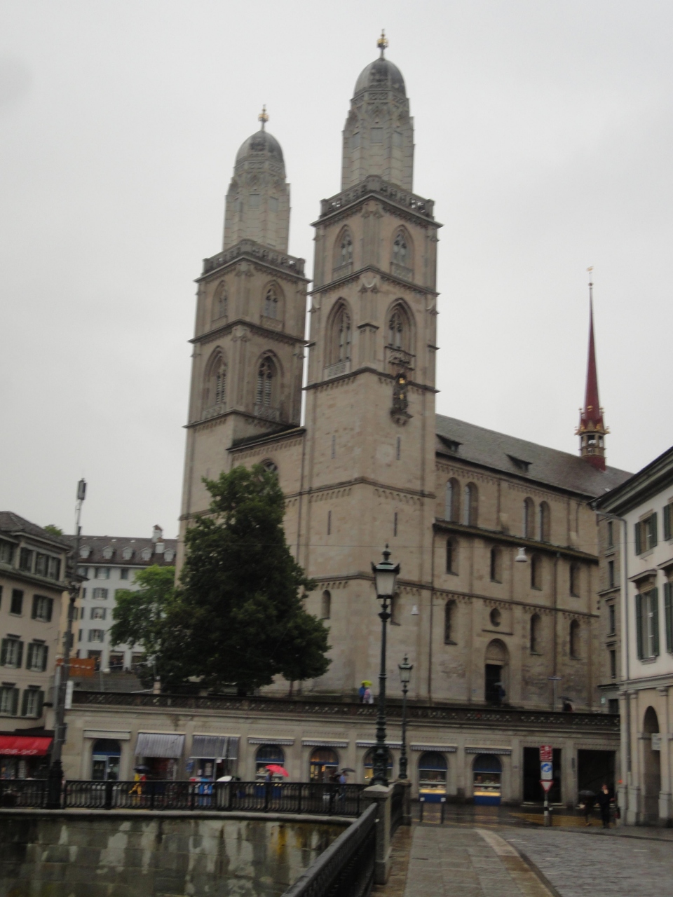 聖母聖堂を背に、橋を渡り階段を登ると、大聖堂 Grossmünsterが建っており、スイス最大のロマネスク様式の2本の塔をもつユニークな建築様式で11世紀から12世紀初頭にかけて建てられたそうだ。川面に向かってこの教会の窓近くに座っている像はカール大帝だ。中に入ると、暖色系の色合いのステンドグラスで心も暖まる思いがした。後で調べたら、アウグスト・ジャコメッティ作とのこと。地下の礼拝堂にはかなり古い壁画がわずかに残り、歴史を感じられた。また、塔に上ると、チューリヒの町をパノラマビューで見渡すことができた。