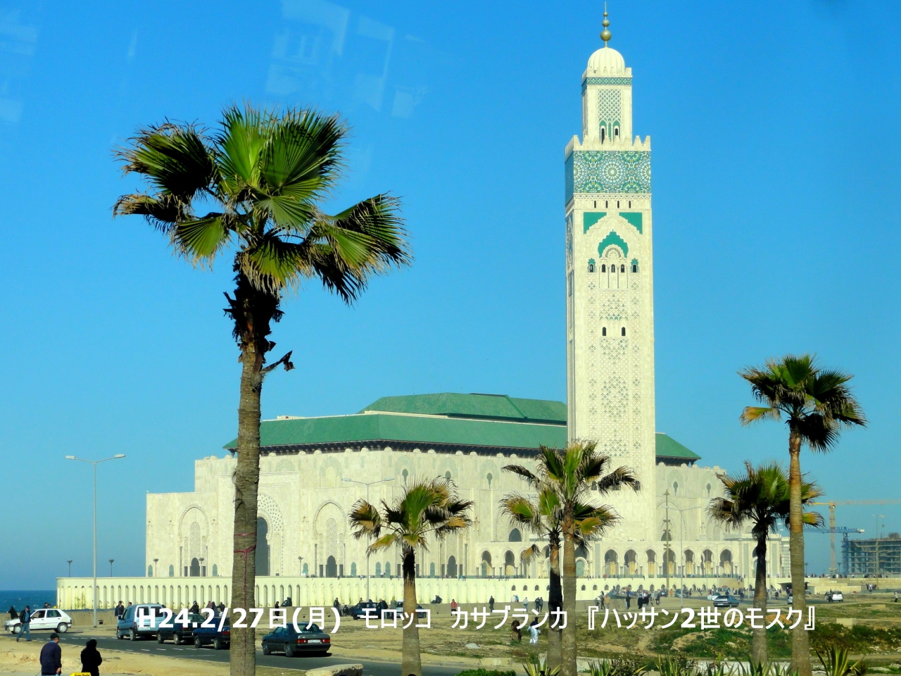 カサブランカの観光名所「ハッサン2世のモスク」は、海に突き出た異国情緒あふれるカサブランカを象徴する建造物です。広い敷地に周りは青い海に囲まれ、白いモスクが浮かび上がるように建っています。空の青と海の青、白いモスクが何とも言えない素敵な雰囲気をかもし出していました。
