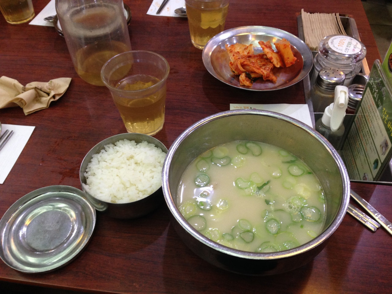 あの白濁スープを写真で見てからぜひ行ってみたいと思っていたのになかなか行けなかったお店にようやく行けました。場所はロイヤルホテルのすぐ前。朝の8時頃でしたが、かなりの人(日本人)が並んでいました。そのビルの2Fにはおかゆの店がありそちらは中国人が並んでいた。次の予約が迫っていたのですが何とかぎりぎりはいることが出来ました。相席になりました。普通のソルロンタンと饅頭入りのをオーダー。味が薄いし単調なので食べている間に飽きてきました。塩やキムチを入れてみましたが美味しいとは思えませんでした。残念でした。友人は饅頭は美味しかったと言っていました。わざわざ行くほどの味ではないように思いました。