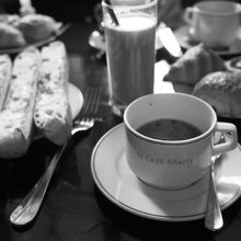 ルーブル美術館の敷地内にあるカフェ。朝食を食べに行きました。世界有数の観光名所なので混んでるかなと思いきや、お客さんは私たち以外に2組しかいませんでした。さすがに2月のパリは寒いのでテラス席は断念しましたが、窓際の席で、ガラスのピラミッドを眺めることができました。
