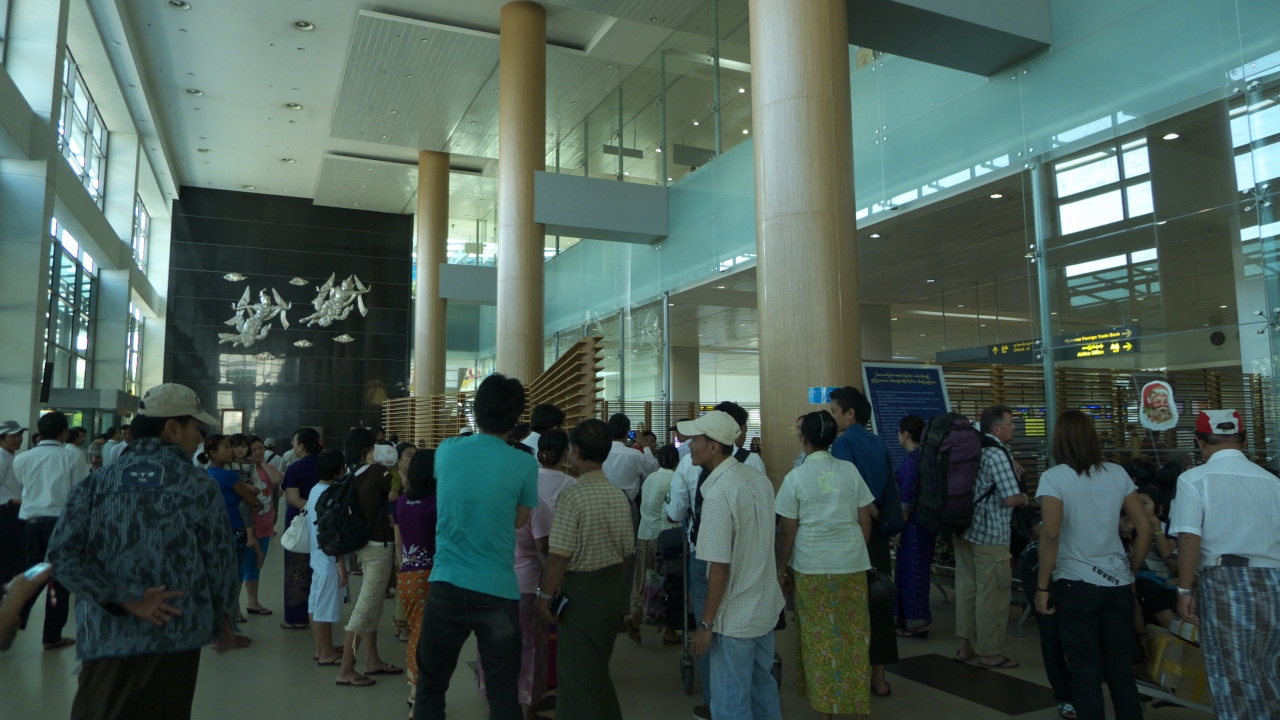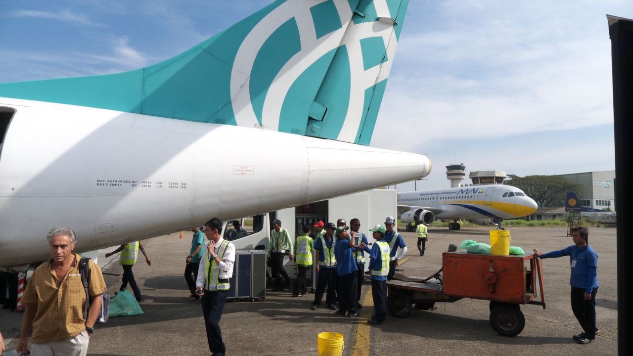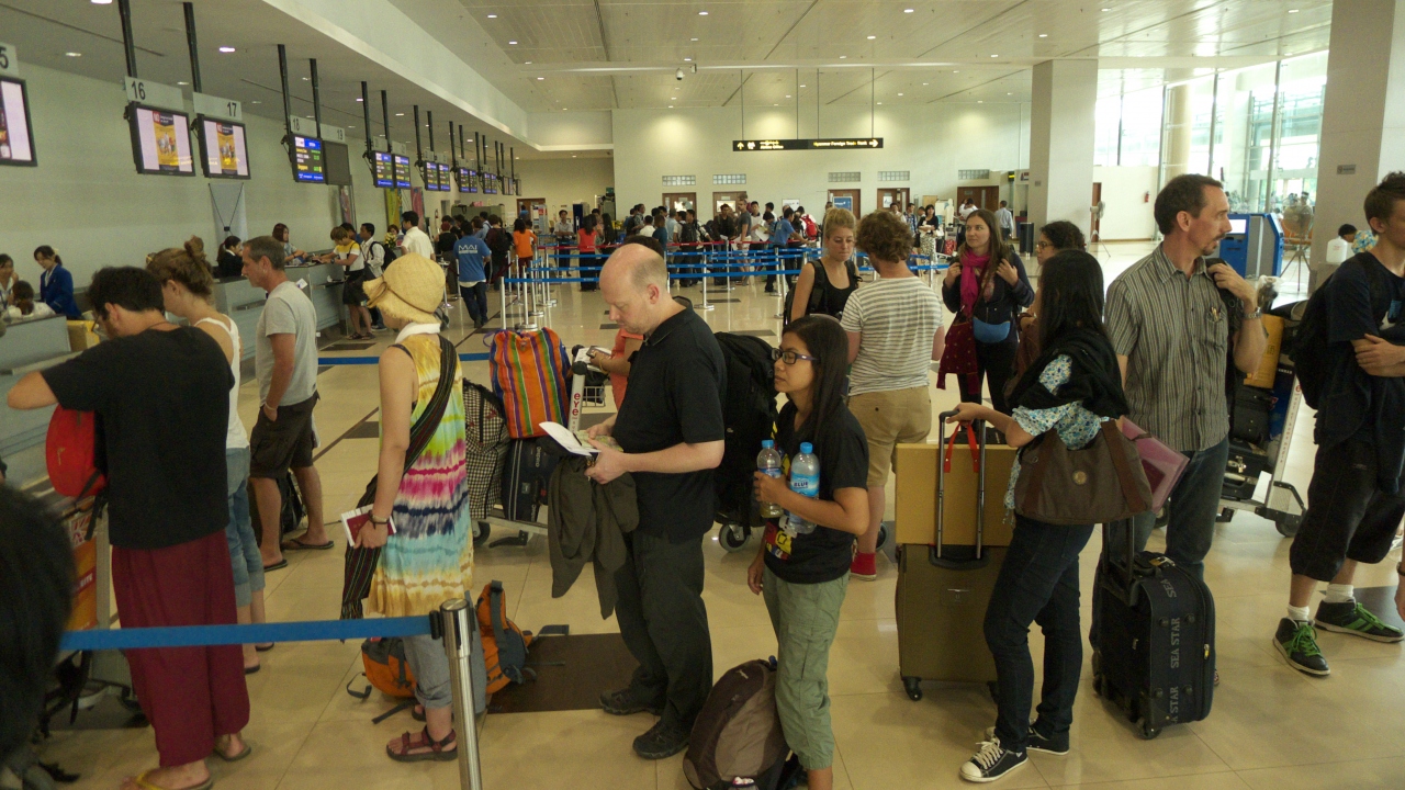 市街からは$6でした。途中新しい高架の道も完成し、30分ほどで到着します。国際ターミナルの建物は新しくとてもキレイです。建物の中に入るとすぐにセキュリティチェックがあり、乗客以外はそこから先に入れないようでした。国内線ターミナルは木が使われていて昔ながらの作り、チケットも手書きだったりとアナログでした。