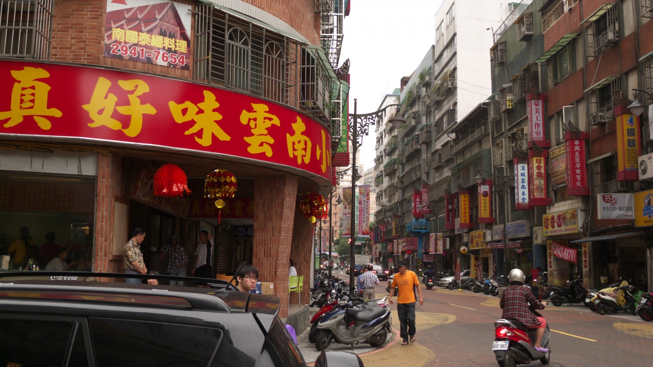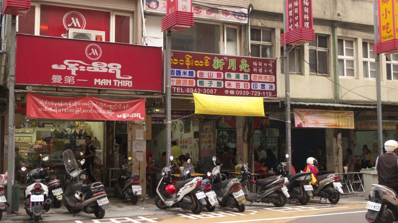 台北捷運中和線の終点、南勢角駅から歩いて10分ほどの華新街の周辺にはミャンマー系の人々が多く行きかっています。食堂などもビルマ語表記が目立ち、ミャンマー人街を実感出来ます。食堂には、スーパーやコンビニからビールを持ち込む事が出来ます。華新街周辺は南洋観光美食街という名前が付いていて、ミャンマー料理以外にも、回族料理や雲南料理など、ご当地料理の店が多く集まっていました。