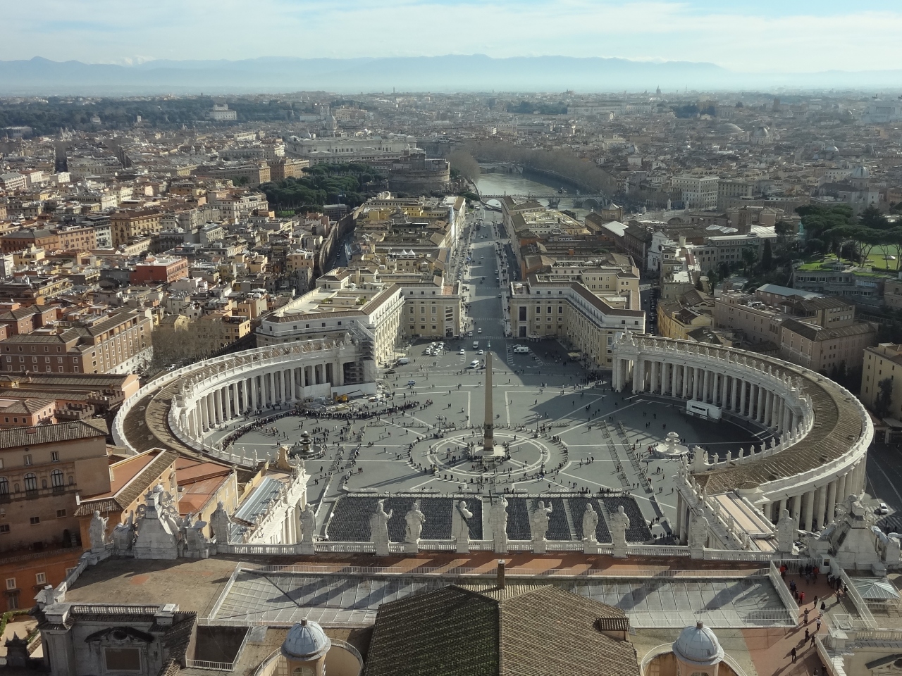 ローマ滞在中、日曜朝と木曜朝の2回行きました。日曜朝に写真撮影をした、二重になっている回廊の柱が1本に見える点でもう一度写真撮影をしたいと思い、木曜朝に向かったところ、ミサの準備で椅子が置かれ、入場制限がされてしまっていました。教会内部もそうですが、いつでもどこでも自由に見ることができるわけではないことに、注意が必要そうです。